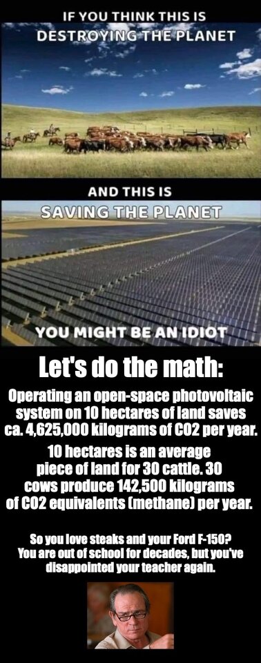 Vor allem, da man nur 1/4 der gezeigten Fotovoltaik sinnvoll aufstellen kann und dann Sonnenschutz für das Gras sowie Wetterschutz für Kühe hat!Der Witz ist, dass der Vergleich Kühe <> Photovoltaik genauso sinnvoll ist, wie Brot <> LED.