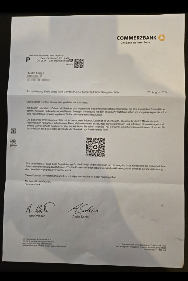 Ja, die Commerzbank warnt aktuell selber vor diesen Schreiben.Wirklich Fake?