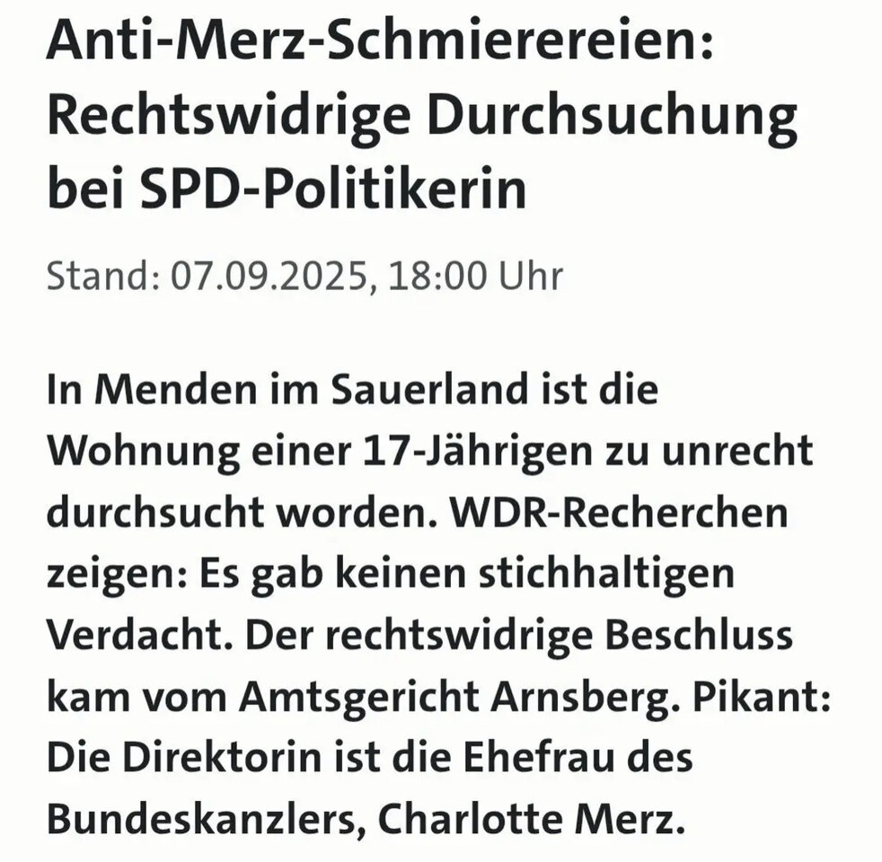 Wegen Merz-kritischer Graffiti ist das Haus einer 17-Jährigen durchsucht worden. Genehmigt wurde das laut dem WDR durch ein Gericht, dem Merz' Ehefrau vorstehen soll.www.zeit.de