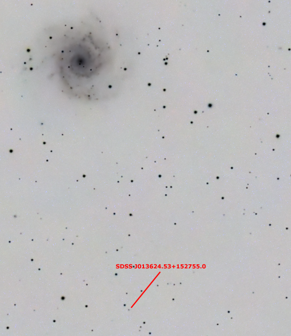 Es war dann möglich einige Quasare zu finden und zu identifizieren. Der "Vogel wurde abgeschossen" vom Quasar SDSS J013624.53+152755.0. Hier sieht man ein Negativ einer Aufnahme der Galaxie Messier 74 (sog. Phantomgalaxie), die etwa 32 Mio. Lichtjahre entfernt liegt. Das markierte kleine blasse Pünktchen ist der Quasar, der etwa zwischen 9,728 Mrd. und 11,770 Mrd. Lichtjahren von uns entfernt ist. What? Yes..
