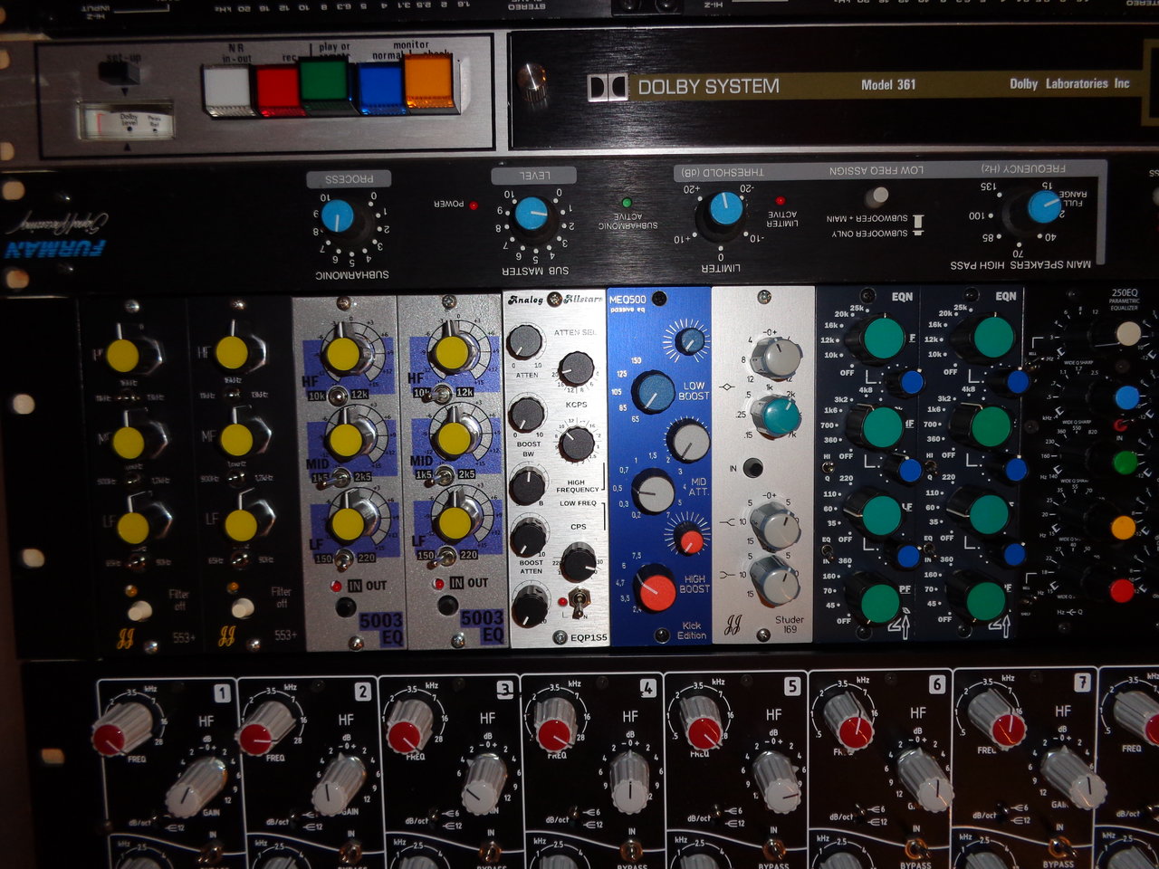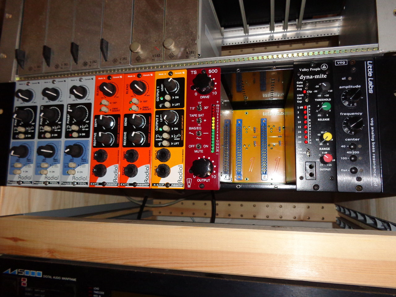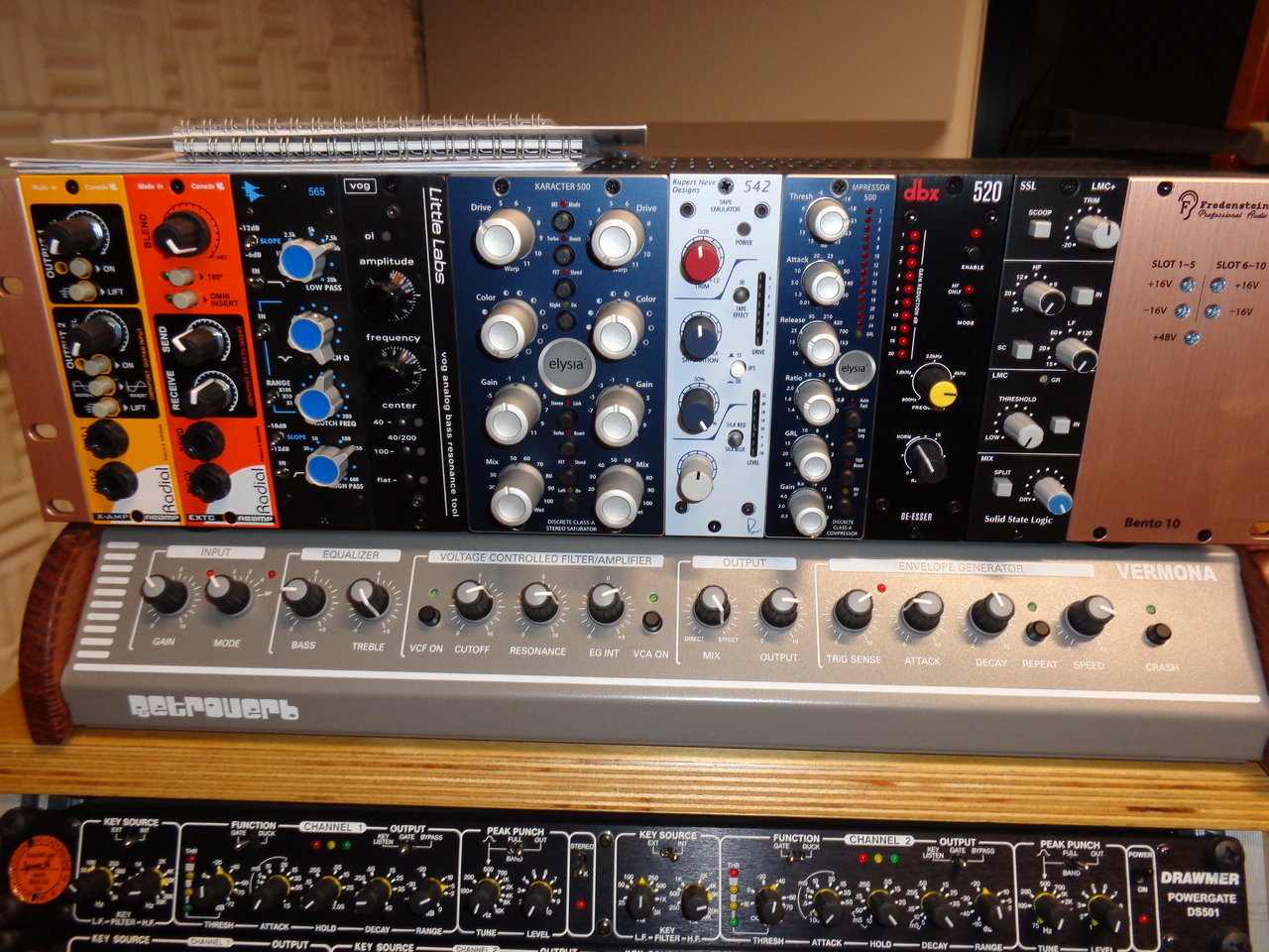 Es gibt noch zwei weitere 500er Racks, aber eines davon steht bei einem Kumpel im Studio. Davon habe ich kein Foto. Und das zweite Rack wird gerade erst befüllt. Da müsste im Laufe der Woche das eine oder andere Paket hier eintrudeln. Im Wesentlichen sind es aber Module, die im letzten Foto auch schon zu sehen sind, so daß alles in stereo vorhanden ist.