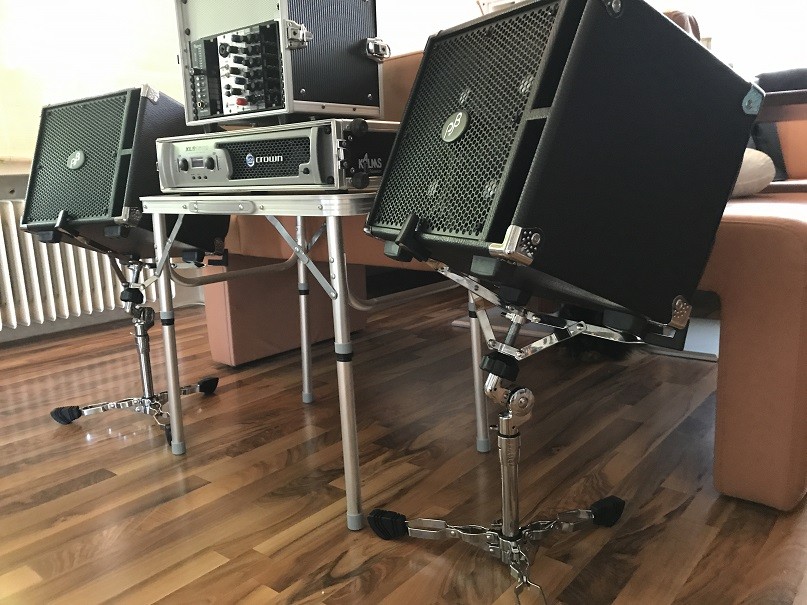 Um die Boxen auch freistehend und variabel „aufs Ohr gezielt“ nutzen zu können, bin ich auf die Idee gekommen dafür Snare Stands zu verwenden. TAMA hat da ein mittelpreisiges Produkt für € 65,- pro Stück, welches super stabil ist, und sich ohne grosse Fummelei aufbauen lässt.