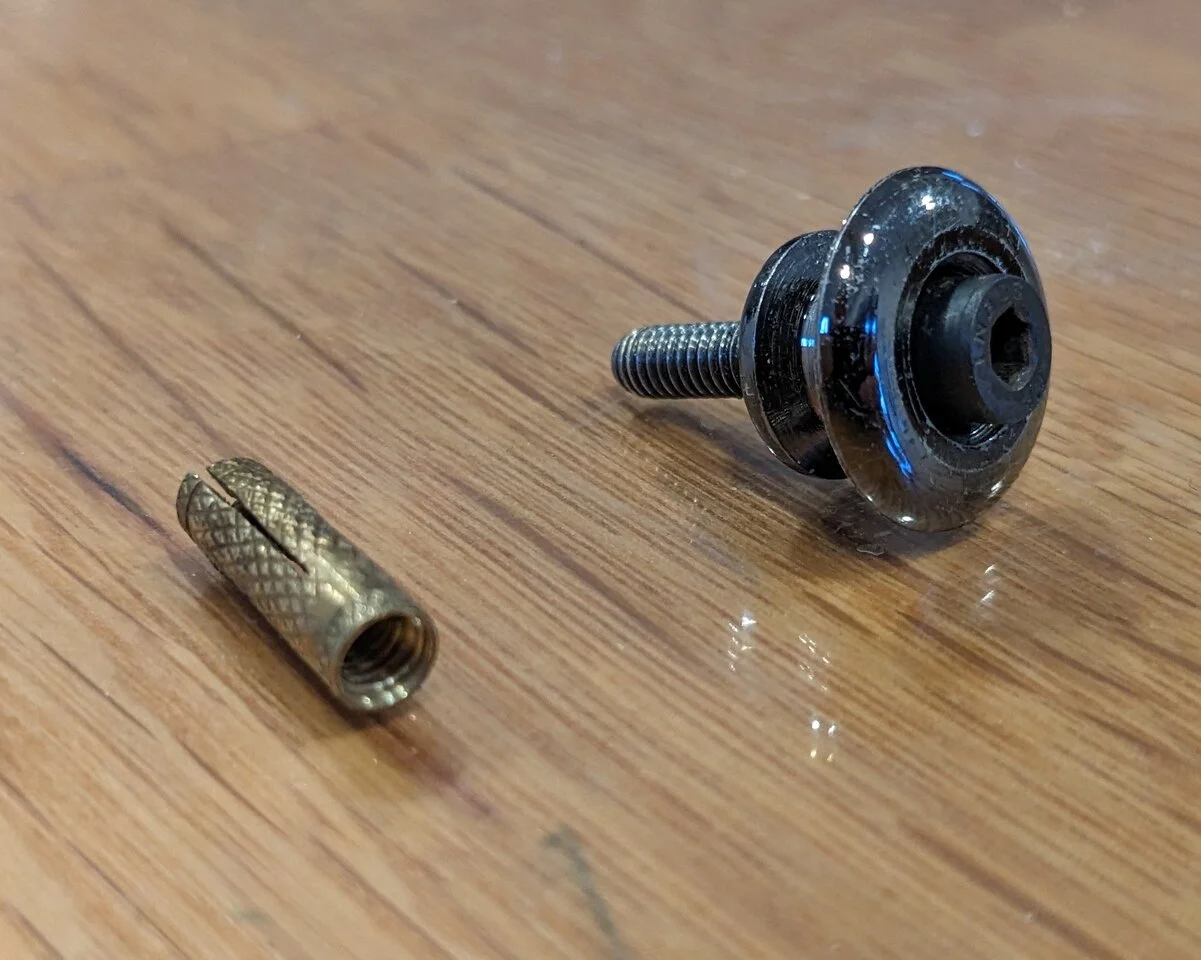 Eines der Gurtpin Löcher an einem meiner Bässe ist abnormal groß. Ich habe hier noch ein Set Schaller Security Locks aber die Schrauben sind viel zu klein für das Loch.
