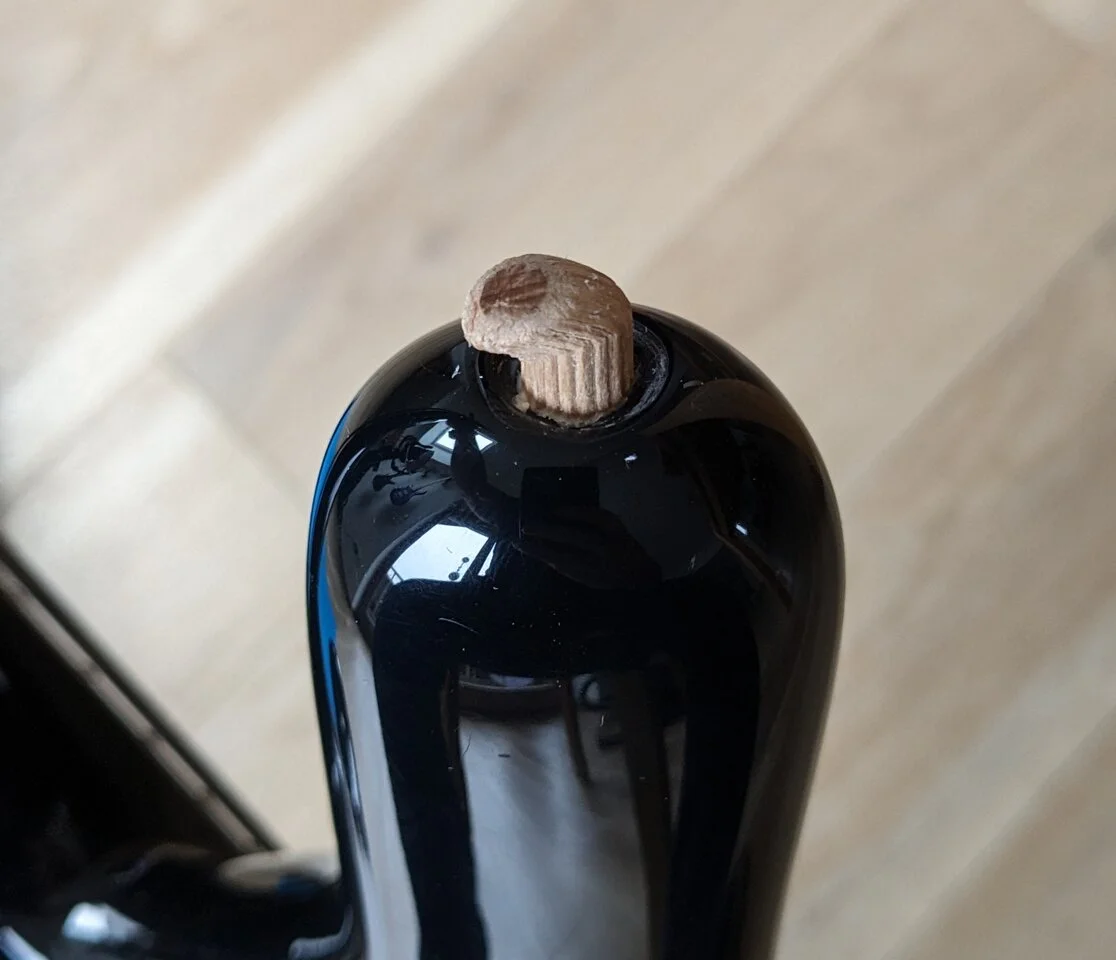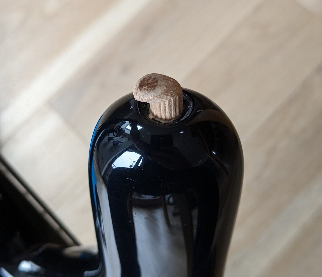 Mein Gedanke war das Loch mit etwas Holzleim zu füllen und dann ein passendes Holzstäbchen reinzuschieben. Dann absägen, ein passendes nicht zu großes Loch dort hineinbohren und dann den Schaller Gurtpin reinschrauben.