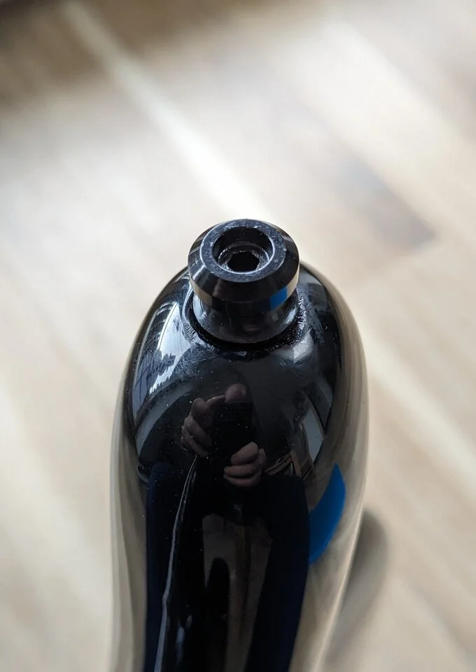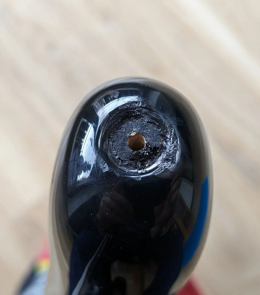 Meine Fresse, wer hat das denn verbrochen? Soviel zum Thema "Befestigungssysteme - falsch verstanden". Leute gibt's...Am oberen Horn sieht mir das sehr nach einer DIY Lösung aus. In dieses ziemlich große Loch kommt eine Art Metalldübel und da wird dann mit den Gurtpin zusammen eine Sechskantschrauben gedreht was eine eher fummlige Angelegenheit ist weil sich der Dübel auch erstmal ein bisschen mitdreht und die Schraube so Schwierigkeiten hat ordentlich zu greifen und den Dübel auseinander zu spreizen.
