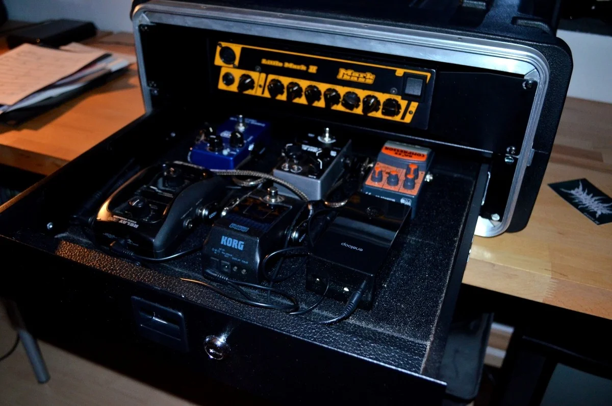 Die umgekehrte Lösung wäre einfach ein etwas grösserer Koffer mit ein paar Schaumeinsätzen. Ist jetzt auch nicht die oberschickste Lösung, aber funktioniert ziemlich gut. Ich bin aber genauso ein Perfektionist und bekomme Ausschläge am Hintern wenn ich vor dem Gig Leute sehe, welche einzelne Pedale auf der Bühne mit drei verschiedenen Netzteilen zusammenketten...