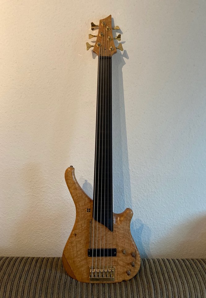 Das hier ist auch ein Prototyp. Den hatte Holger Stonjek in den 90ern mal für sich selbst gebaut. Dass dieser doch einen anderen Besitzer gefunden hat liegt daran dass seine Manufaktur damals sehr klein war, und es war gerade kein anderer 6-Saiter fretless verfügbar. So waren seine Worte "Na, dann nimm den hier. Ich baue mir dann einen Neuen." Der Klang von dem Ding ist einfach nur spitze.