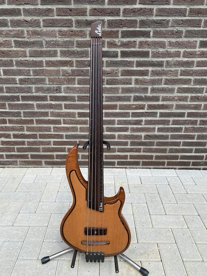 Ähnlich wie der unten abgebildete. Nur 4-Saiter, mit J-J-PUs, Bedienfeld im forderen Horn (statt hier als Räder an am unteren Korpusrand versteckt) und "klassischerer" Kopfplattenlösung.