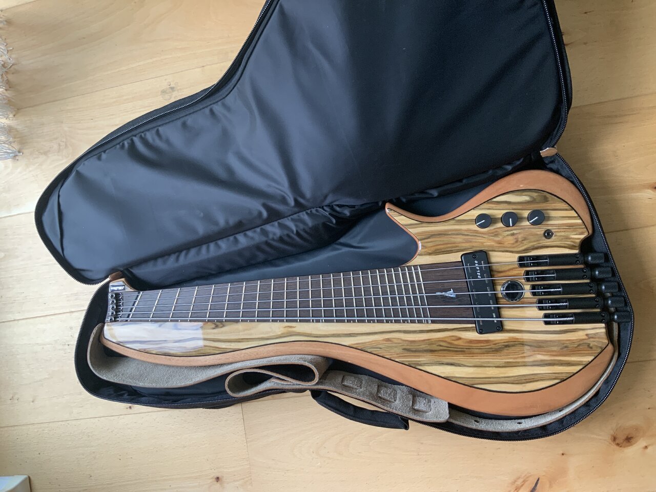 Ich hab so einen. Das ist ein tolles Instrument. Der hat einen Satz 5-String Basssaiten drauf, ist aber in EADGC gestimmt. Das ist ein fettes E für so eine kurze Mensur… Ich finde, der sieht cool aus, ist beim Spielen aber gewöhnungsbedürftig, die Greifhand kann um den 5 Bund mehr Bünde übergreifen. Mich hat das zum ausprobieren und experimentieren inspiriert. Gebaut werden die bei Meridian Guitars in Italien. In dem steckt mehr, als man es von sonem Pickolo erwarten würde. Er ist aber für meinen größten Reisekoffer trotzdem zu lang. Samt Gigbag aber viel kleiner, als ein normaler Bass. Der kann echt überall mit. Davide, der Erbauer, hat mich drauf hingewiesen, dass es einige Profis gibt, die den live auf der Bühne als Hauptbass spielen. Das ist er: