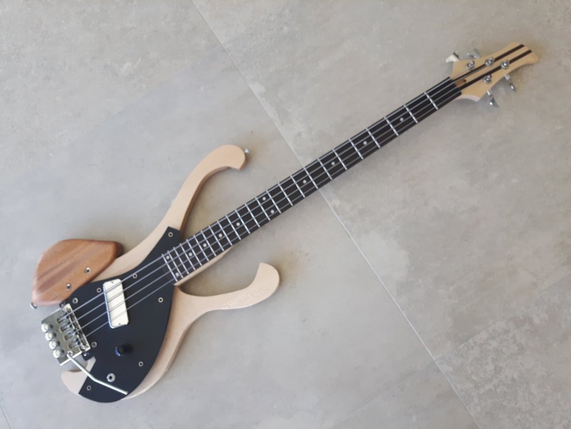 Ich wollte einen Bass mit Vibrato. Gibt’s nicht zu kaufen, also hab ich mir einen gebaut. Der Hals hat 24 Bünde, die Grundplatte ist aus einer 2 cm dicken Soft-Ahorn Platte mit der Stichsäge gesägt. Das Carbonpickguard ist foliertes Sperrholz, die Konstruktion darunter hab ich aus einer 1cm...www.gitarre-bestellen.de