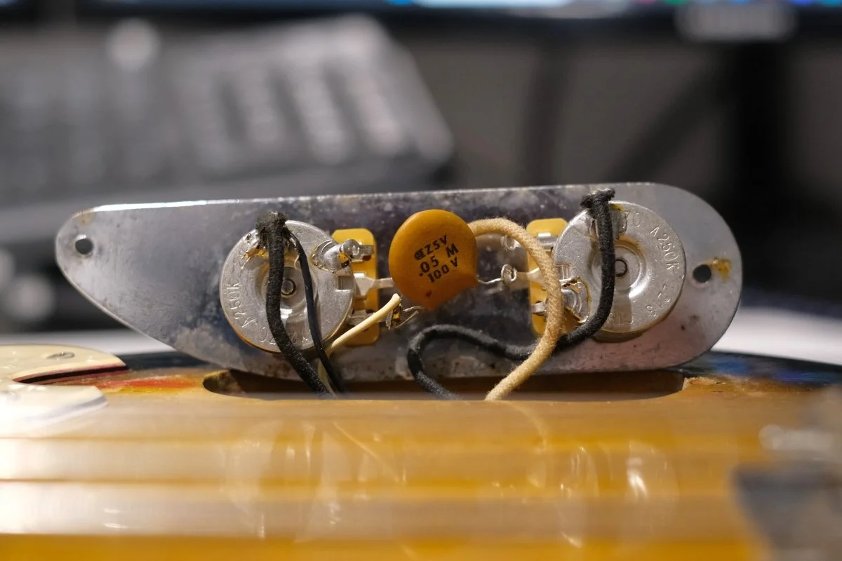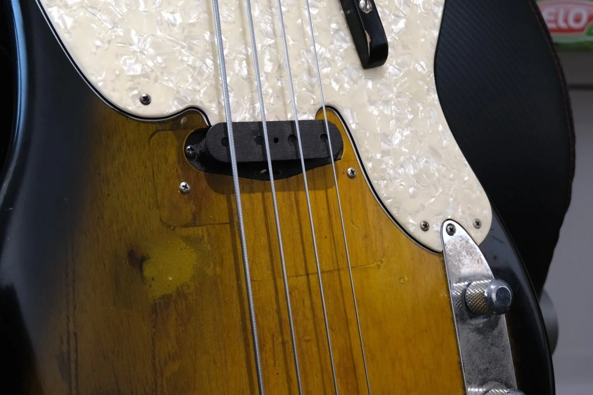 Der Body war mal bunt gestrichen und hatte einen P-Splitcoil verbaut. Der wurde dann irgendwann wieder auf Originalzustand zurückgebaut: entlackt, Holz aufgefüllt, Fräsung für einen Singelcoil, 2-tone-sunburst Lackierung. Also es ist zwar ein Vintage Fender, aber kein Sammlerstück. Und er klingt und spielt sich fantastisch.