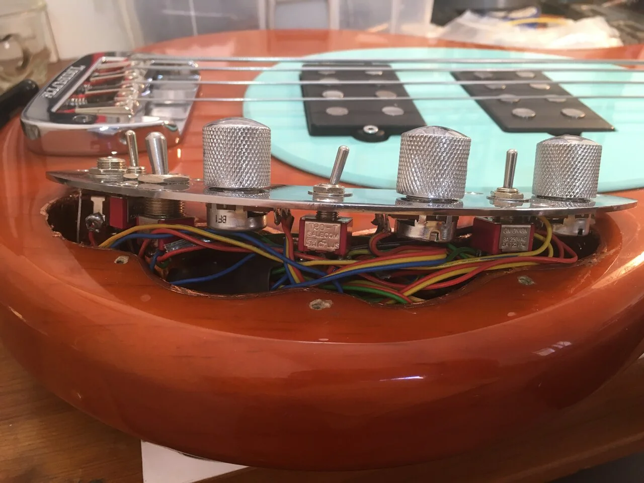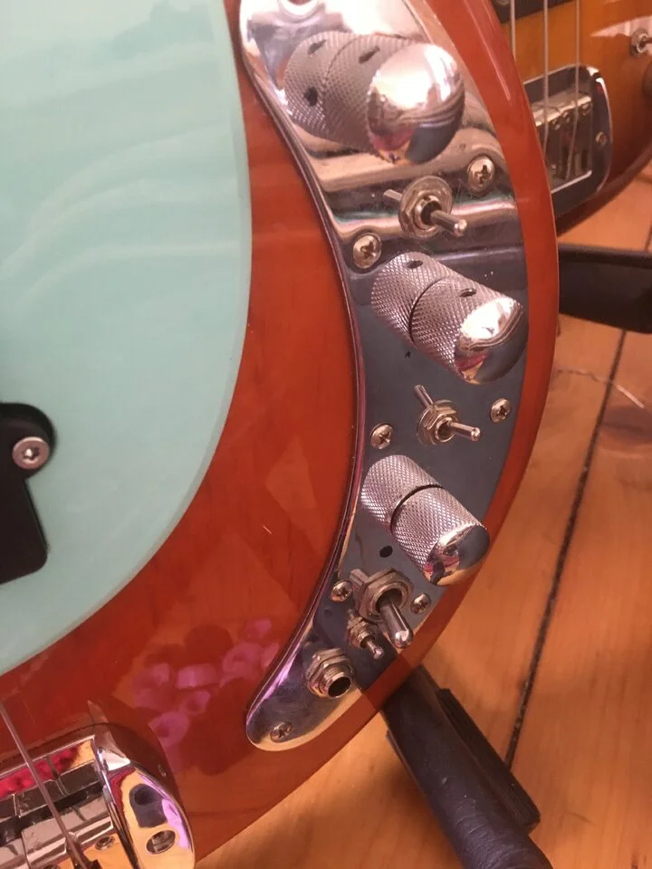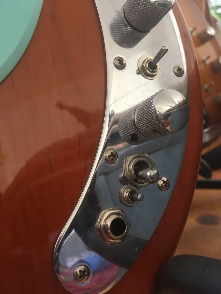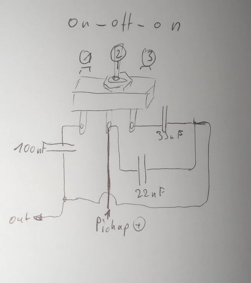 Ziel ist es mit einem on-off-on entweder die Höhen oder die Bässe weiter in den Mitten mit zu beeinflussen. Also Kondensatoren zuzuschalten. Einfach weil der Höhenregler etwas weit oben anpackt für gedämpfte Sounds und der Bassregler etwas weit unten sitzt um Bass und Tiefmitten vor allem raus zu regeln.