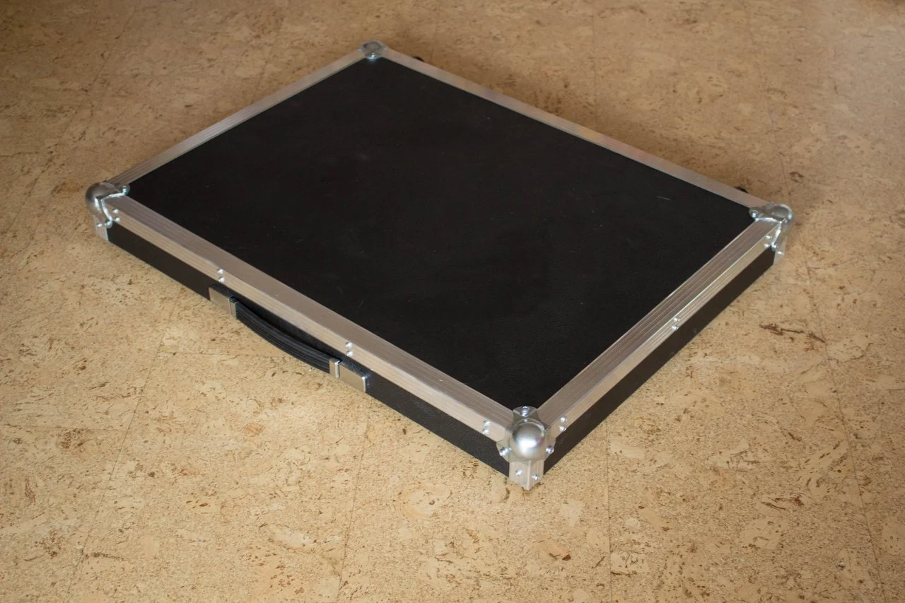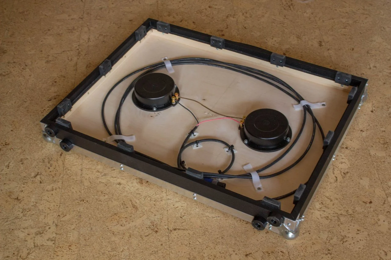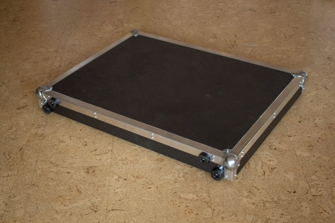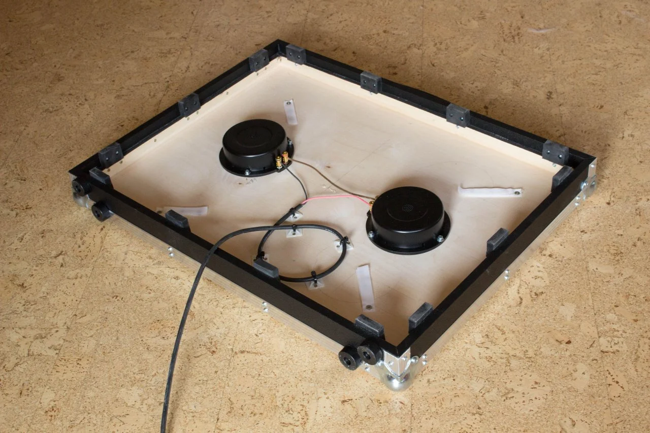 Von den Mitmusikern hat keiner die Vibration gespürt. Das Board steht auf einer geschlossenen Holzbühne (Trommelprinzip), aber da war kein Wummern zu vernehmen. Die Bühne ist mit Teppich belegt, ist sicher ein kleiner Vorteil. Ich habe in der Mitte der Platte keine Abstützung, das hat mir bei einem Test Vibrationen rausgenommen, die Platte liegt also nur an den Rändern auf. Durch die Abkopplung durch Gummiblöcke steht das Ding wie ein Fels, denn Gummi auf Teppich ist quasi unverrückbar. Man kann's kaum wegschieben. Die Fläche ist für mich ausreichend groß und man kann auch mit Anlauf draufspringen, da wackelt nix. Durch die Kugelecken reißt man sich auch beim Vorbeistreifen nix auf. Es geht auch gut aufrecht hin zu stellen, da auf der vom Griff gegenüberliegenden Seite 4 große, flache Füße sind.