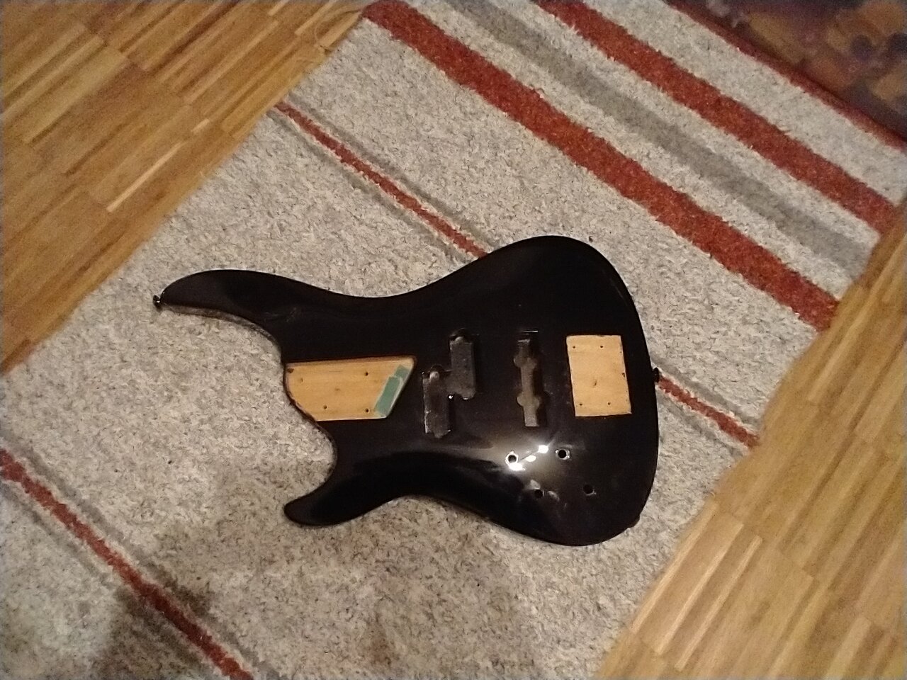 mein aktuelles Bauprojekt geht dem Ende entgegen (Danelectro Hodad Remix nenn ich es mal) und ich will das nächste langsam vorbereiten. Da ich für den Danelectro ja einen Hals zugekauft habe, bzw. einen anderen Bass dafür zerlegt habe, liegt hier noch ein Korpus rum. Genauer gesagt ein Vester Linkshänderbass-Korpus in richtig verranztem Schwarz. Der wurde definitiv benutzt und war zuletzt wohl auch schwer mit Zeug beklebt. Form ca. wie dieses Modell (der im Inserat ist wohl Shortscale, meiner ist 34"):