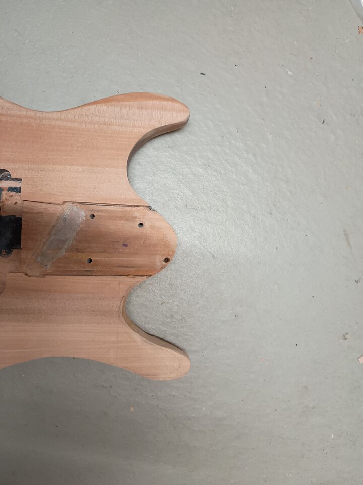 Auf mich wirkt es etwas unproportional. Das ist ein Linkshänder, den du auf rechts umbaust, richtig? Dadurch, dass du aus dem langen Horn ein kurzes gemacht hast, müsste für mein Gefühl der ganze Korpus etwas schrumpfen. Kannst du "hintenrum" am Body noch was wegnehmen und das untere Horn, etwas kürzen, etwas runder gestalten und evtl. auch tiefer in den Korpus laufen lassen?Anhang anzeigen 912837