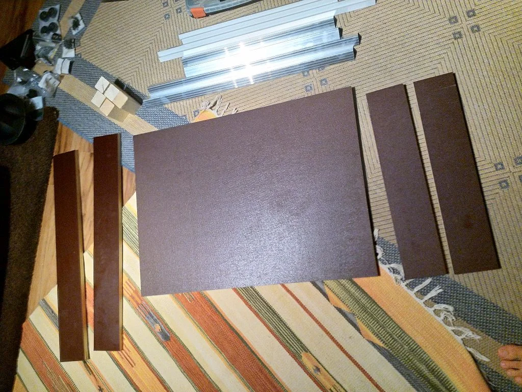 Dann noch 4 Pollin Shäker, ne Tube Montagekleber, ein Paar Schrauben, ein Vierkantholz, Aluprofile, Griff, Anschlussschale, Stahlecken und Gummifüße.