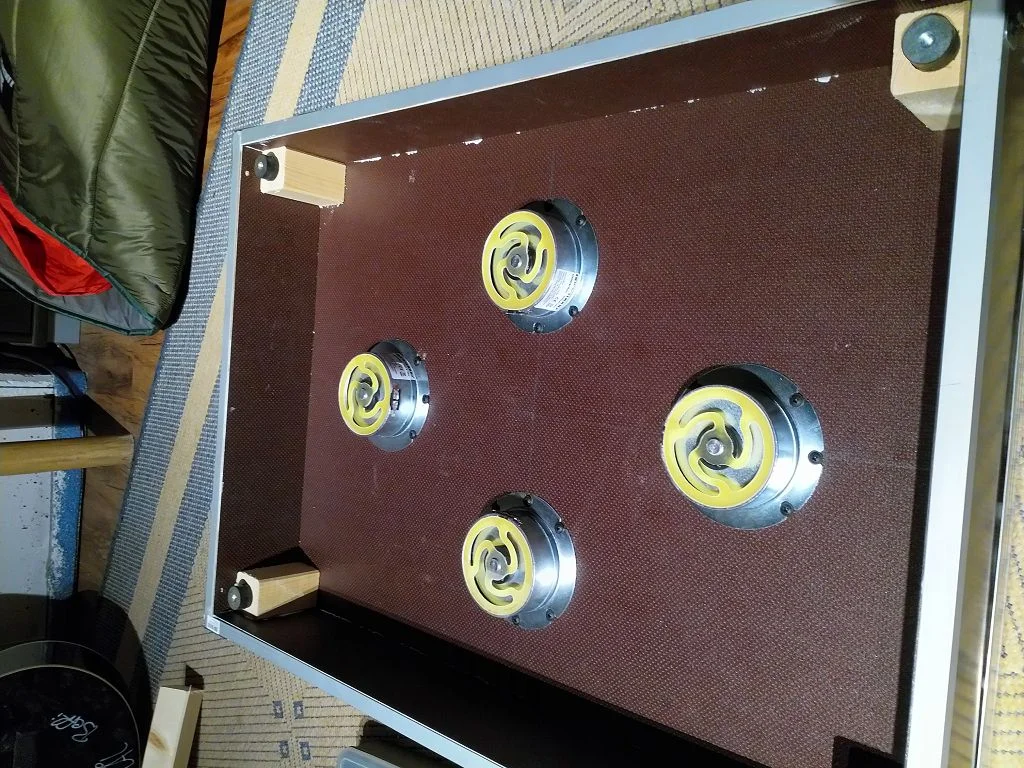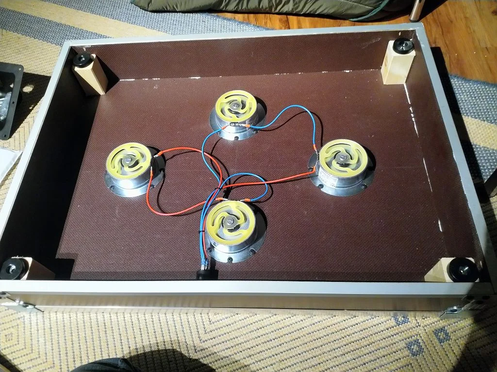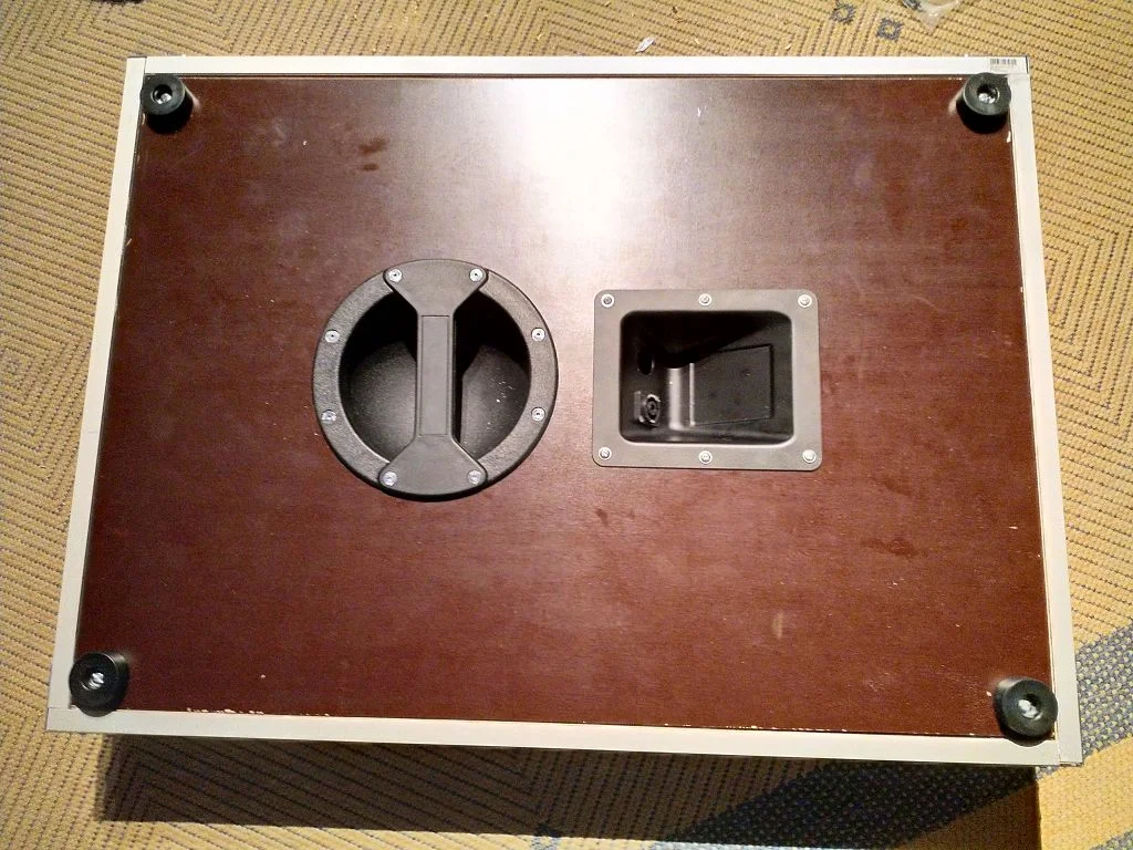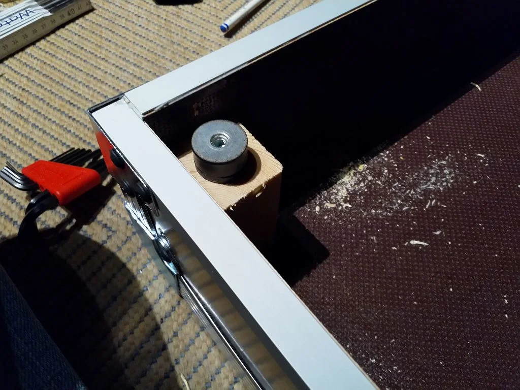 Die Gummipuffer habe ich später wieder rausgemacht und einfach 10 cm Gummifüße von Adam Hall als Zwischenschicht rein gebaut.