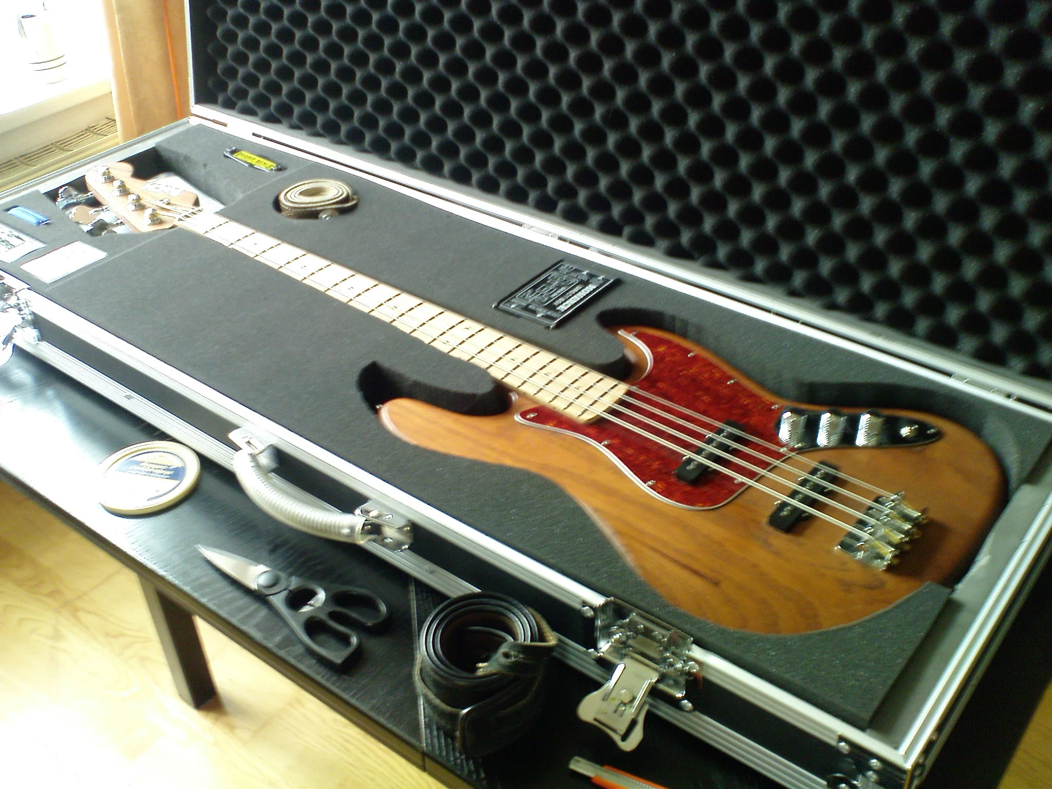 Das Case besteht aus mit PVC überzogenem Sperrholz mit Aluminium-Kanten, hat abgerundete Chromecken und eine zentralen Stahlfedergriff mit durchsichtiger PVC-Hülle. Die Deckel-Innenseite ist mit Noppenschaumstoff gepolstert. Geschlossen gehalten wird es mit zwei großen Butterfly-Verschlüssen. So ist der Bass für jeden Tour-Einsatz bestens geschützt. Ich habe es sehr wenig benutzt, die letzten 2 Jahre stand es im (trockenen) Keller.