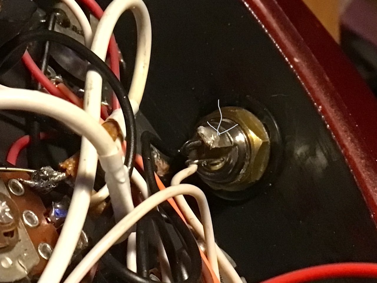 Genau dort habe ich das Kabel angelötetman kann es nicht erkennen , aber an dem anschluß mit dem pfeil gehört die masse der potis :