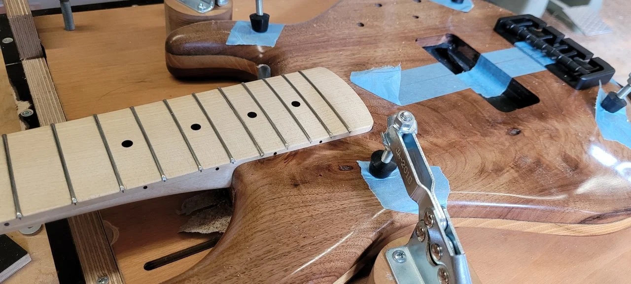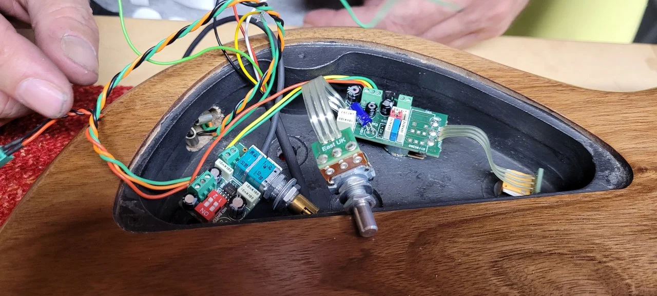 Nach der langen Zeit des Ölens und Aushärten-lassens fanden wir ein Wochenende zum Finish: Griffbrett finischen mit Abrichten und Bünde polieren plus - ganz grosses Ding - die Halstasche. Wenn ihr euch das Mini-Video anschaut, wird klar.... leider passt das Video nicht, deshalb nur Foto: das passt aber sowas von sowas - vielen vielen Dank, lieber Oli von https://www.moerel-guitars.ch ! Kurzversion: Wir trafen uns Samstag um 11.20 Uhr in der Werkstatt, die wir um 23.20 Uhr verliessen, um im nahen - schalldichten- Probelokal zu testen, ob was rauskommt oder nicht. Denn der Hals war das eine, das mit tausend mal nachmessen, tausendmal die Standfräse - ihr erinnert euch: alt, schwer, eine Diva mit eigenen Macken, was die Präzision anbelangt - mit gaaaanz wenig Isolierband um den Bolzen nachjustiert, tausendmal den Hals in die unfertige Halstasche eingepasst, wieder gemessen, wieder justiert, wieder gaaanz wenig Isolierband weggeschnitten.... Irgendwann spätnachmittags sass der Hals. Kein Haar passt da rein zwischen Hals und Body. Perfekt. Dann erstmal ein Bier aufgemacht und gedacht: Jetzt folgt der lockere Teil: Pickup ist bereit und gesplittet verdrahtet, 3-Weg-Schalter ist bereit, Schema auch, und die John-East-Elektronik ist ja quasi plug&play. Aber das Ganze machte uns - äh, vor allem Oli, dem Mess-&Löt-und Elektronik-Fachmann - irgendwie nicht ganz Freude. Leider konnte ich im Vorfeld keine absolut "richtige" Verdrahtung namentlich des 3-Weg-Schalters (Seriell-parallel-SingleCoil (wofür eigentlich??)) organisieren. Und so landeten wir am Ende im Probelokal, in den SWR-Kombo eingestöpselt und.... Mittestellung=Seriell=Mördersound, Funkmonster, serrr schön. Grundsätzlich: dieses Sustain!!! Nur: In den Ranstellungen des 3-Wegschalters war dann wenig Freude: Am einen Ende des 3-Wegschalters ein dünnes, leises Irgendwas, am anderen Ende des 3-Wegschalters.... nichts. kein Ton. Tja, und da steh' ich nu: Wunderbarer Bass, Seriell funzt alles; inzwischen hab ich gelesen, dass eigentlich die Parallel-Schaltung der Spulen DEN Stingraysound ausmache. Deshalb hier mal die Frage in die Schwarmintelligenz-Runde aller Super-Stingray-Profis: Wie geht die korrekte Verdrahtung von Pickup zu 3-Wegschalter zur Elektronik? Verbindliche Hinweise jederzeit willkommen!