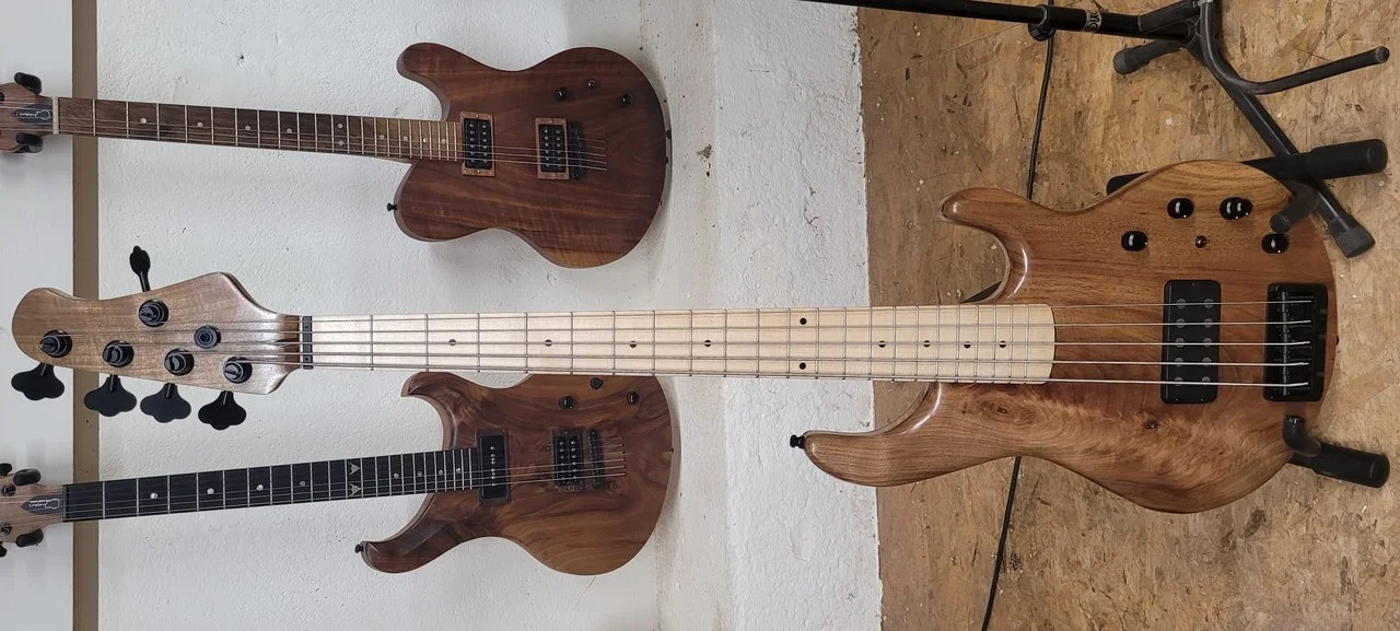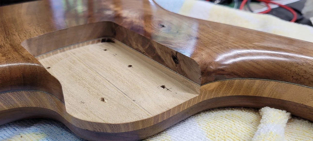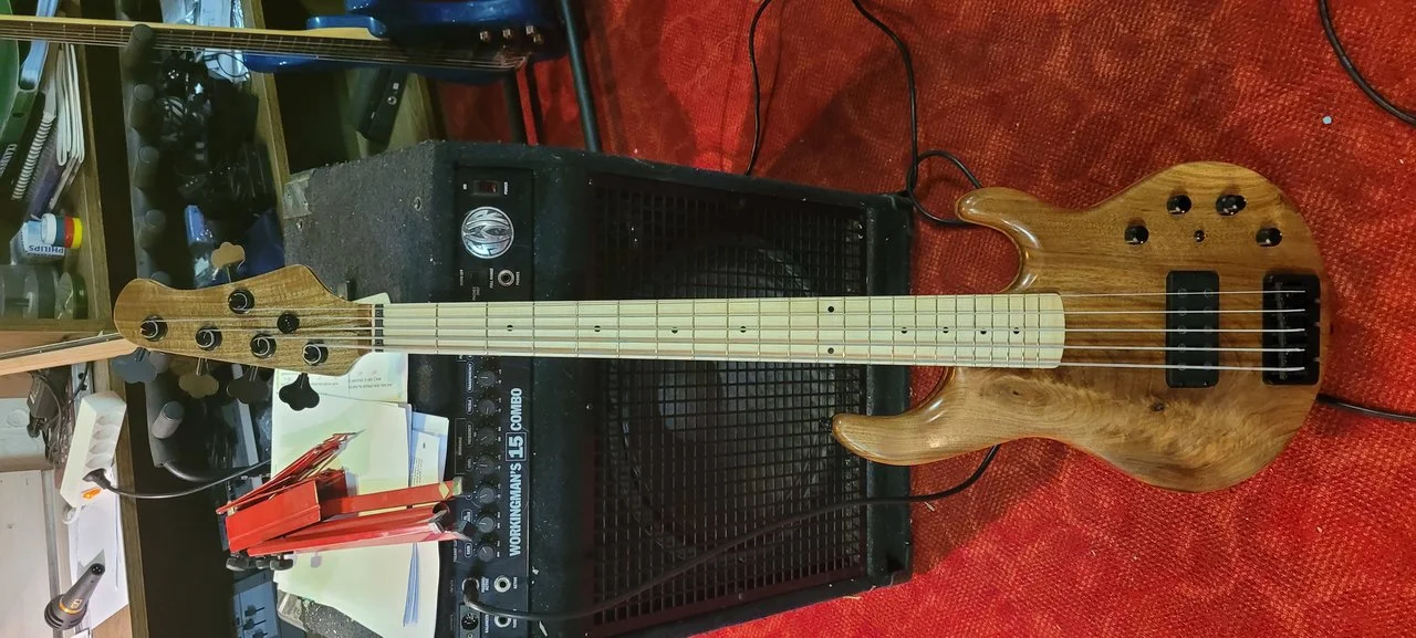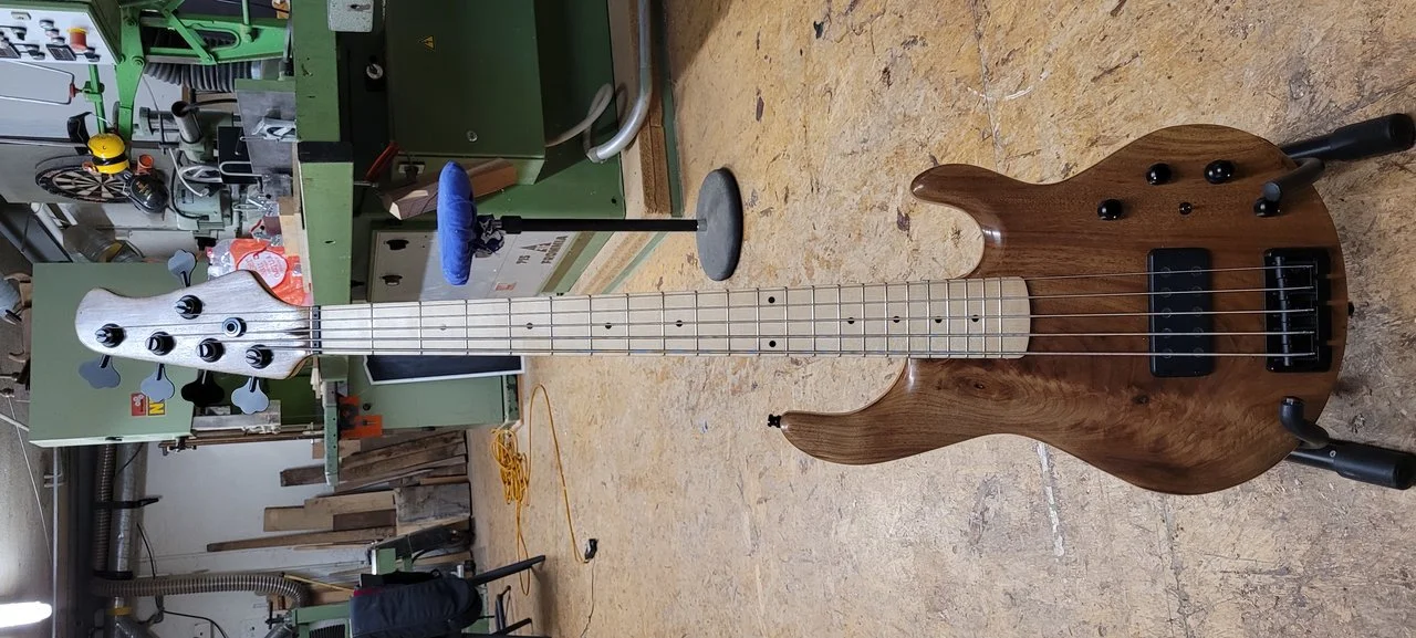 P.S. Dieser Stingray (Kosename "Stingbert", weil mir Bert Gerecht von Hotwire https://hotwire-bass.de/ unglaublich unkompliziert und jederzeit mit Rat und Tat zur Seite stand) wiegt 3,9 Kg (der Hammer!). Das Ölfinish muss ich buchstäblich aufpolieren nach dieser Werkstattsession, aber genau für solches ist TruOil eben auch der Hammer: ErsteHilfe-Set: Rest der TruOil-Flasche, Schleif 180-240-320-400-600-1000fürnÖlschliff und gut ist.