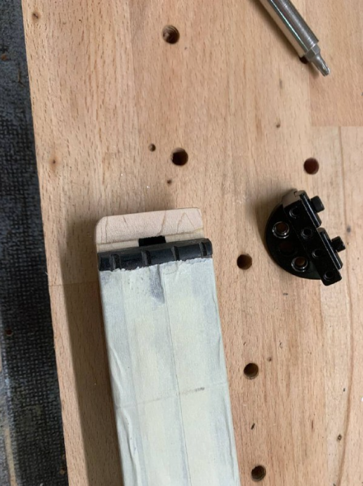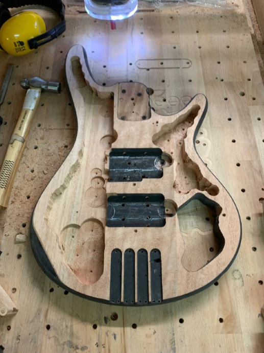 Chambering! Ca 7mm runtergefräst und überall wo ging reingebohrt, zum Schluss noch mal versäubert mit der Fräse. Ich hab dann ein 7mm Birke-Sperrholz-Top aus demBaumarktTonholz-Geschäft aufgeleimt und mit Nitro Vintage White lackiert.