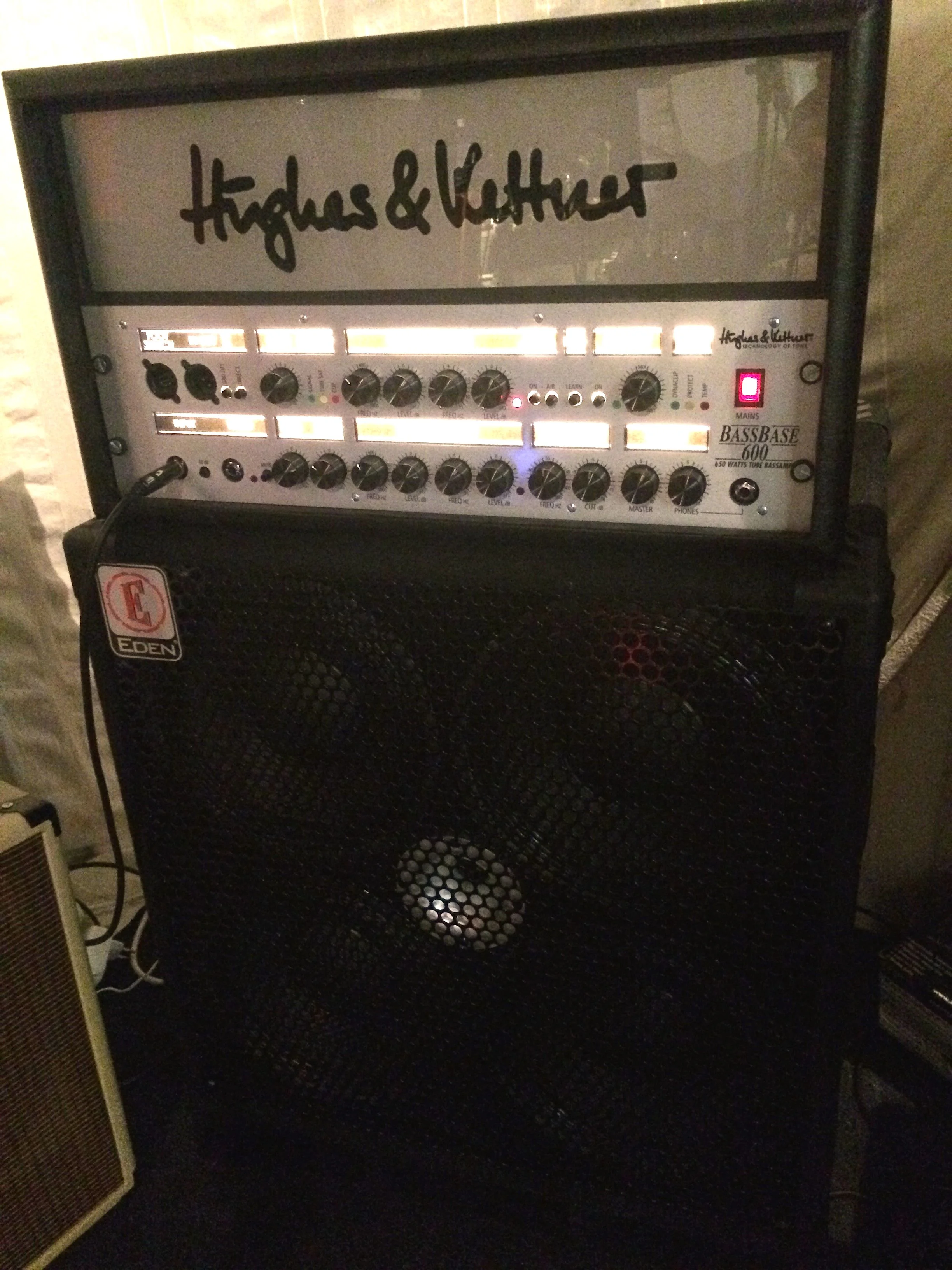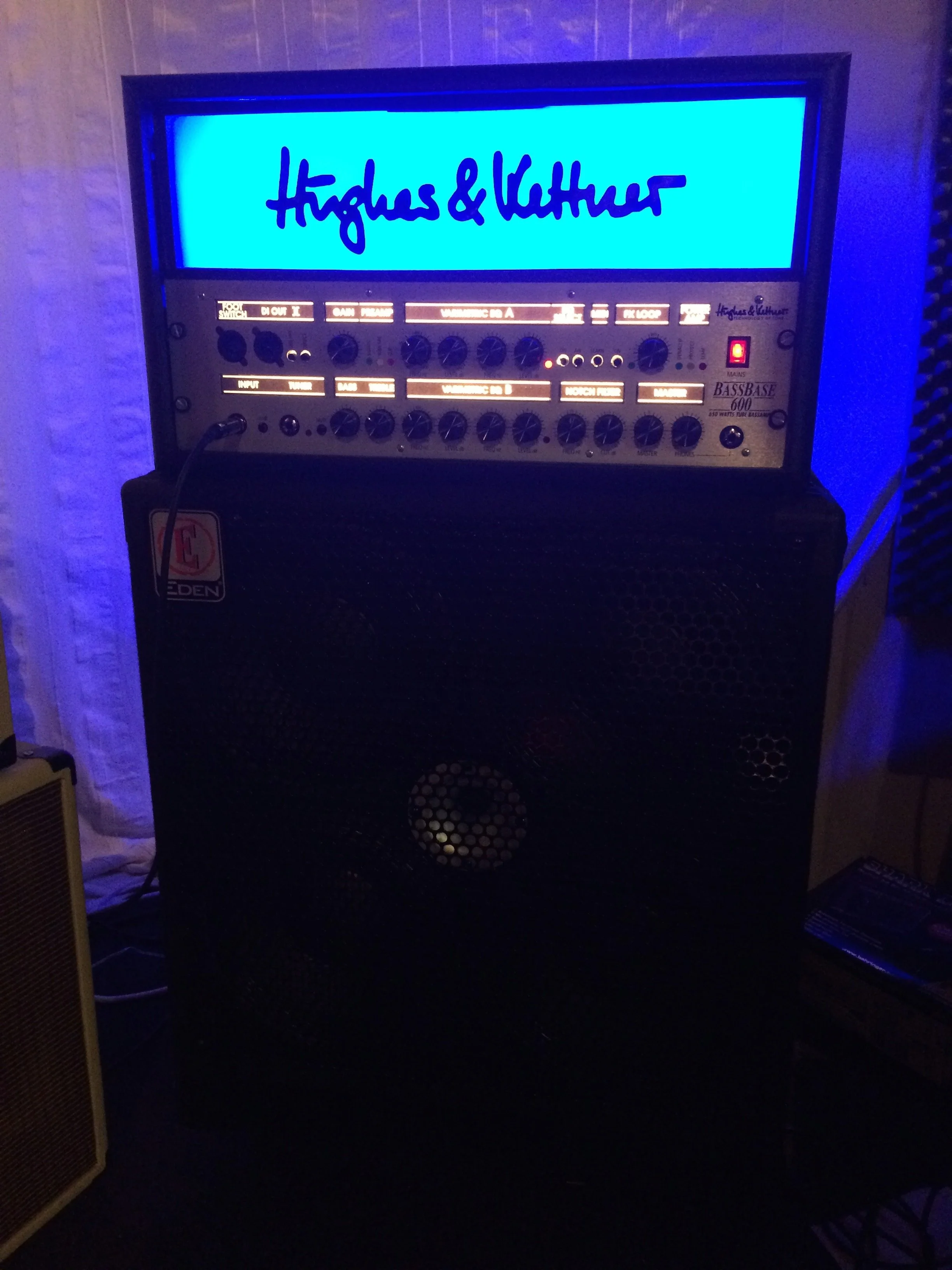Daneben mein BassBase an der Eden 4x10 Box. Er schiebt in den Bässen und den tiefen Mitten. Auch dabei habe ich das Headshell mit dem Logo selbst gebastelt. Habe etwas übertrieben mit der LED-Beleuchtung (kann alle Farben^^). Aber dadurch spart man sich auch die Lichtshow, und außerdem wollte ich unseren Gitarristen ärgern, denn er hält so große Stücke auf seinen