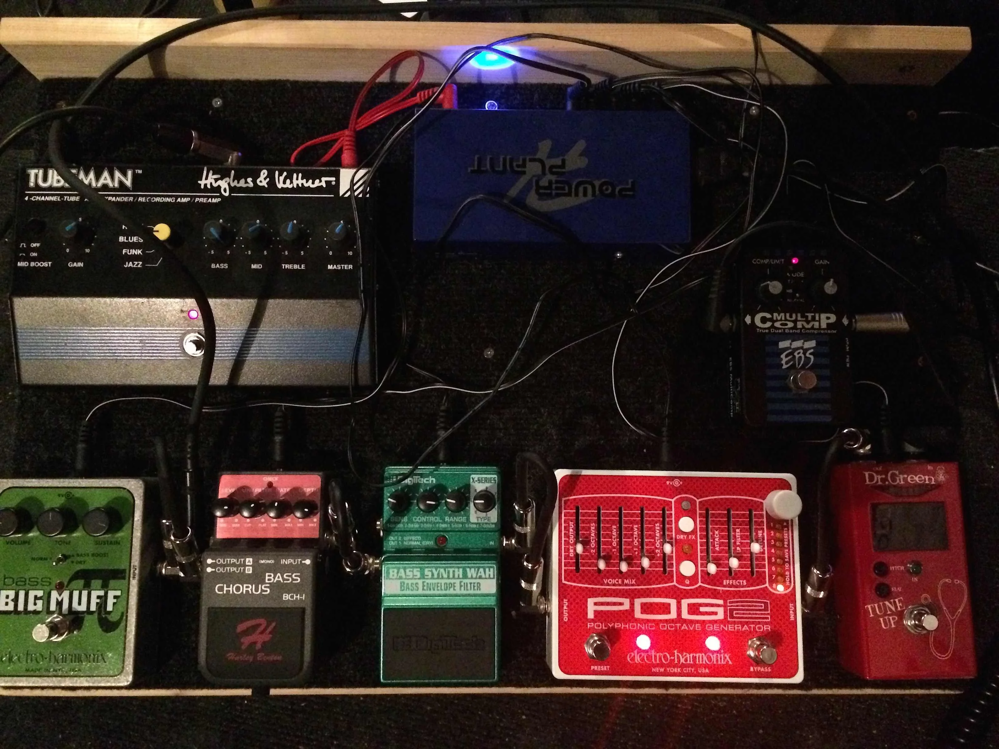 Kompressor --> Tuner --> POG2 (Octaver/kann auch für Swell-Effekte und Orgelsounds verwendet werden) --> Synth Bass Wah --> Chorus (benutze ich nur noch als Weiche). Dann geht's getrennt weiter: