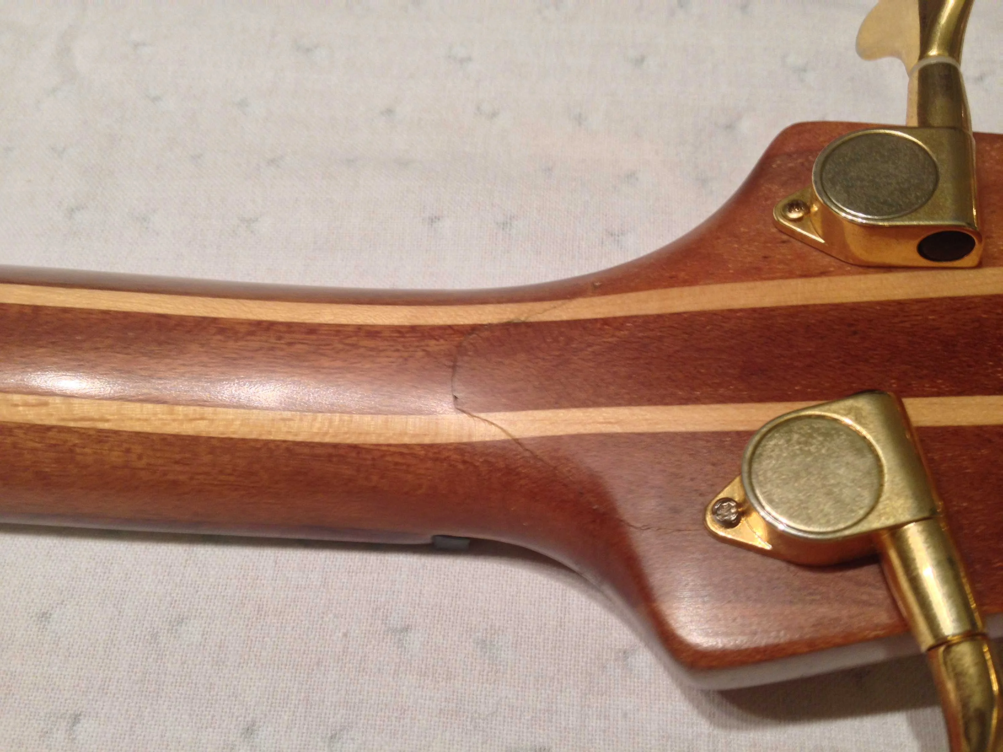 Leider ist die Kopfplatte mal angebrochen. Dies wurde jedoch vom Gitarrenbaumeister repariert (siehe Abbildungen). Außer der etwas "angeknacksten" Optik ergaben sich dadurch zum Glück keine weiteren Nachteile - Sound, Bespielbarkeit und Stimmstabilität wie vorher.