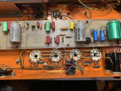 Auf den Bildern traue ich meinen ungeschulten Augen nicht zu, etwas auffälliges zu erkennen, ausser auf den letzten beiden. Auf dem Vorletzten ist rechts dieser kleine hellgrüne Plessey-Kondensator. Der sieht aus, als würde er aufquellen. Der will wie so ne Weisswurst aus der Hülle. Ansonsten sind auch noch einige Originale bzw. Ältere drin, die man alle nach fast 50 Jahren mal austauschen sollte. Aber, wie gesagt, das macht besser ein Amp Tech. Und bei der Gelegenheit könnte er auch die zwei Vorstufenröhrensockel auf dem letzten Bild austauschen.