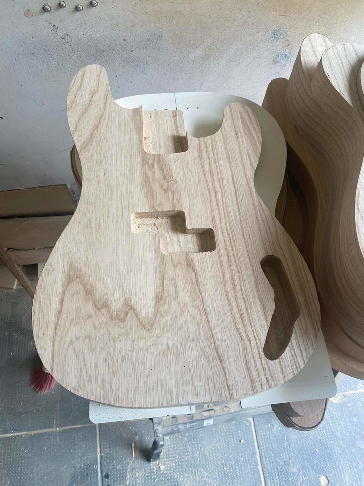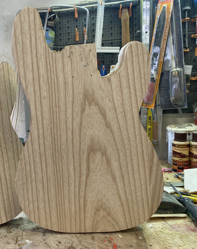 Naja, doch. Das war der Plan von Anfang an und dabei bleibt es. Wichtig war mir nur leichte Sumpfesche ... Maserung egal. Dafür darf dann der Hals und das Griffbrett mit Maserung brillierenSo eine Maserung lackiert man eigentlich nicht zu, oder? Ziemlich einzigartig.