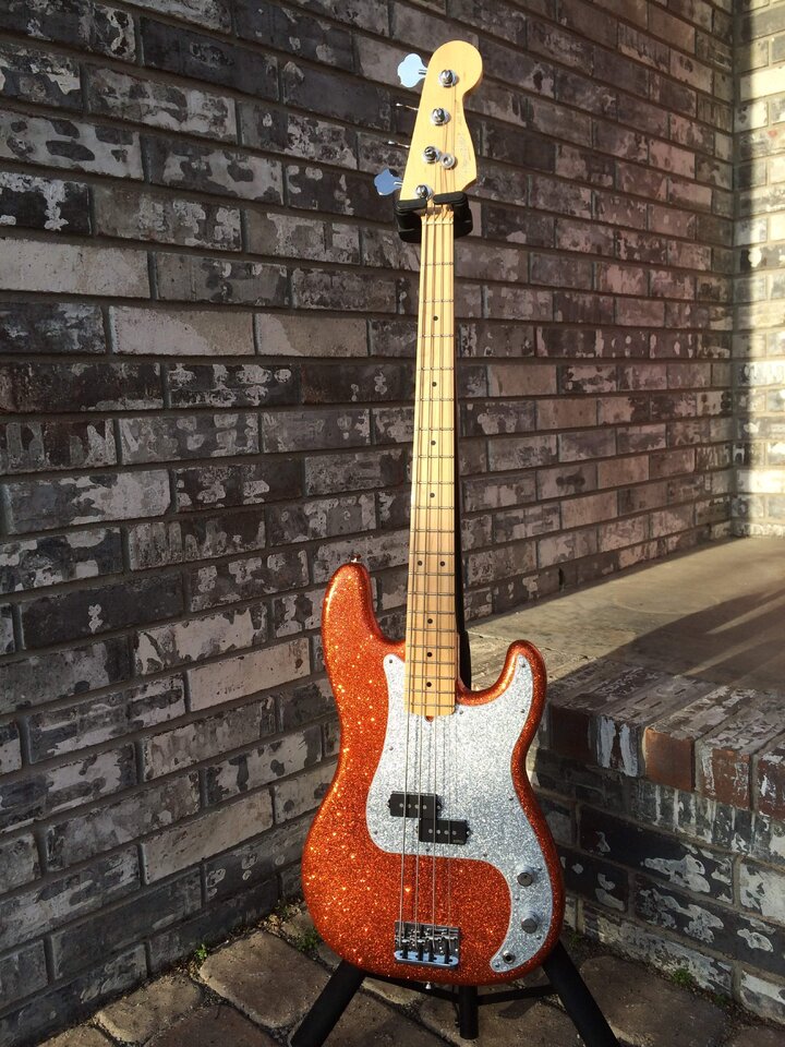 Da wärst Du ja mit einem Docwood oder franchin besser dran, da man dann die Löcher gleich weglassen kann und die häßliche Ausfräsung rund um die pickups auch passgenau ausgeführt werden kann, da wo die Potis sind, muss holz stehen bleiben und von hinten gefräst werden. Mit nem Standard Fender kommt man ja nicht zum Ziel. Und Pickups mit Holzkappen, das bekommt man hin, die müssten hier aber nicht hell, sondern braun bis Mahagoni oder Nussbaum sein. Der helle Hals sieht beim orangen Body auch nur bedingt gut aus. Aber das ist Geschmackssache. Könnte ein richtig geiles Moped werden. Aber ein PU ist mir zu wenig. Ich hab genau einen Preci, das reicht.Ich hatte den hier damals als Ausgangspunkt ins Auge gefasst:
