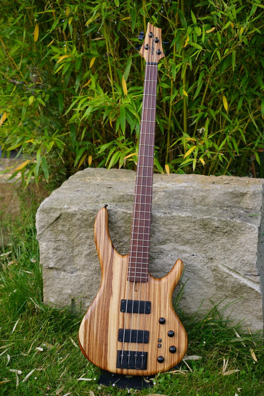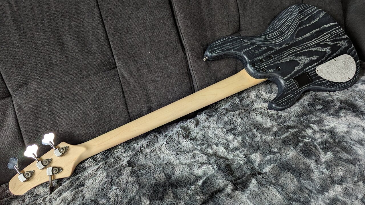 Der Hals hat eine 35 Zoll-Mensur ist 5-streifig und hat ein fettes Griffbrett von ca. 7 mm Stärke. Er ist sehr stimmstabil.