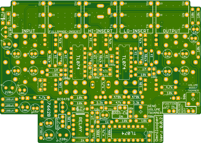 Jop, keine SMD Bauteile. Dafür eine etwas unkonventionelle Bestückung. Die Drehschalter nehmen viel Platz ein. Diesen habe ich genutzt und je vier Elkos an den Stellen untergebracht.
