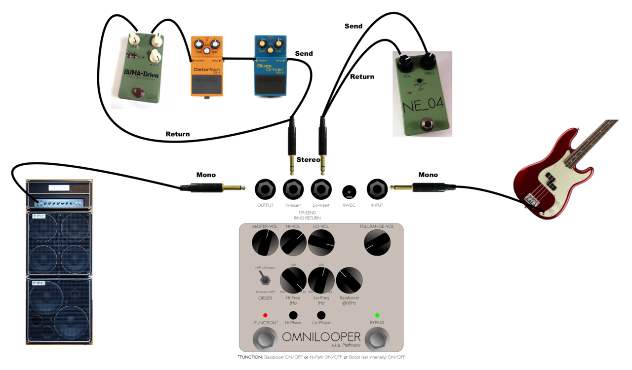 Die Inserts sind gleichzeitig Send und Return für die Effektschleifen. Das wird intern durch Stereobuchsen gelöst, deren einer Kanal eben Send, der andere Return ist.Was ich aber nicht verstehe, ist, wenn es doch ein Looper ist, wo kommen die Signale der externen Pedale zurück?