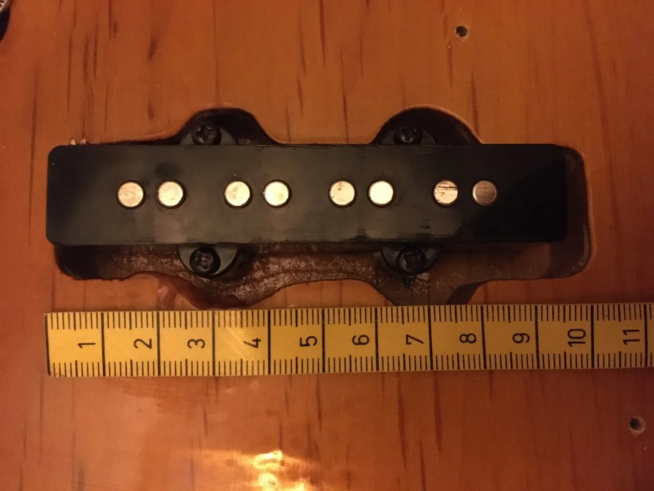Beim Auseinandernehmen meines alten Harley Benton Jazz Basses habe ich nämlich gesehen, dass der Neck PU einen wirklich großzügigen Ausschnitt unter dem gruseligen Pickguard hat. Da der Hals auch insgesamt mehr Fleisch als ein gewöhnlicher JB hat (zwar nicht so viel wie ein Preci, aber gefühlt irgendwo dazwischen), wollte ich einfach mal probieren, ob der mit Splitcoil ein wenig in Richtung Preci käme. Klar, die PU Position sollte auch stimmen (welche wäre da eigentlich korrekt?). Das schönste an dem rechteckigen Ausschnitt ist ja auch, dass ich den PU sogar reversed einbauen könnte. Natürlich vorausgesetzt, der Ausschnitt ist breit genug (wobei ich im Zweifel auch einen Dremel anschmeißen würde). Das Pickguard wird eh ersetzt, da kann ich vorher halt schön rumprobieren.