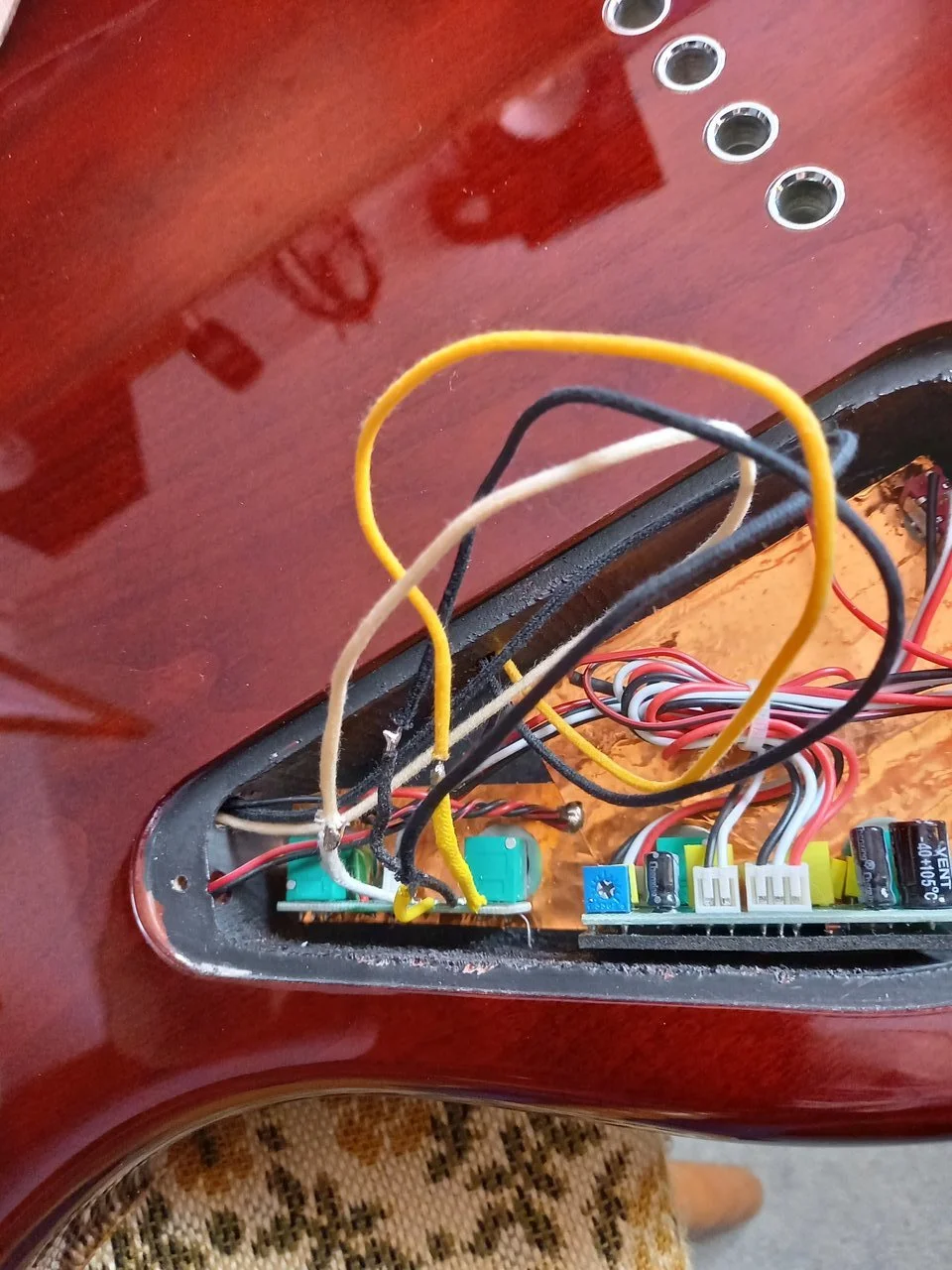 Achja:die Fächer der Pickupbohrungen sind schwarzgelackt,am Boden ist bei jedem ein Massekabel angeschraubt(nicht an den Pickups) und zentral auf Masse geführt(auf dem Foto links über dem Trimmpoti)