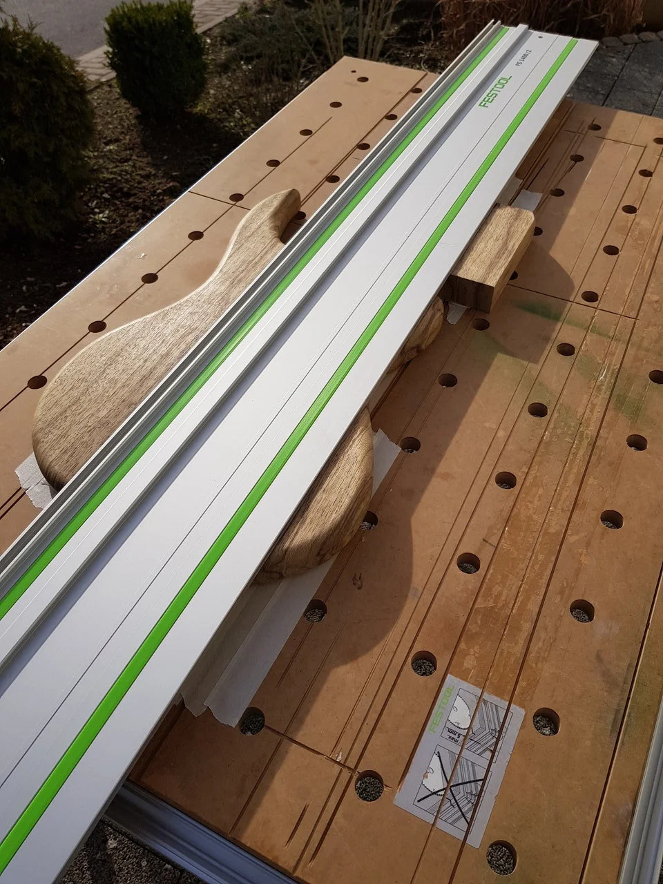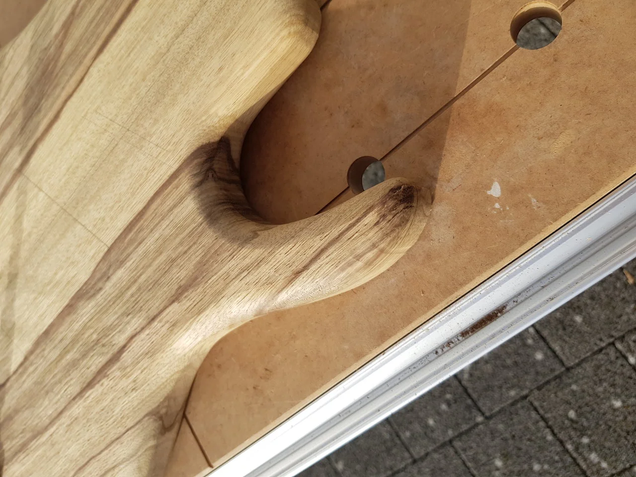 Den Body habe ich auf 38mm gehobelt und danach mit der Stichsäge ausgesägt. Danach mit der Oberfräse und meiner Schablone wurde die Kontur gefräst. Beim Bodyfräsen hatte ich einen kleinen Kipper mit dem Abrundfräser, das konnte ich durch Absägen der Schadstelle und Anleimen eines neuen Stückes beheben. Die Reparatur ist nach etwas Schleifen nicht mehr sichtbar.
