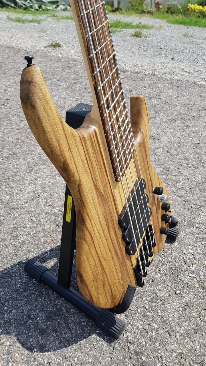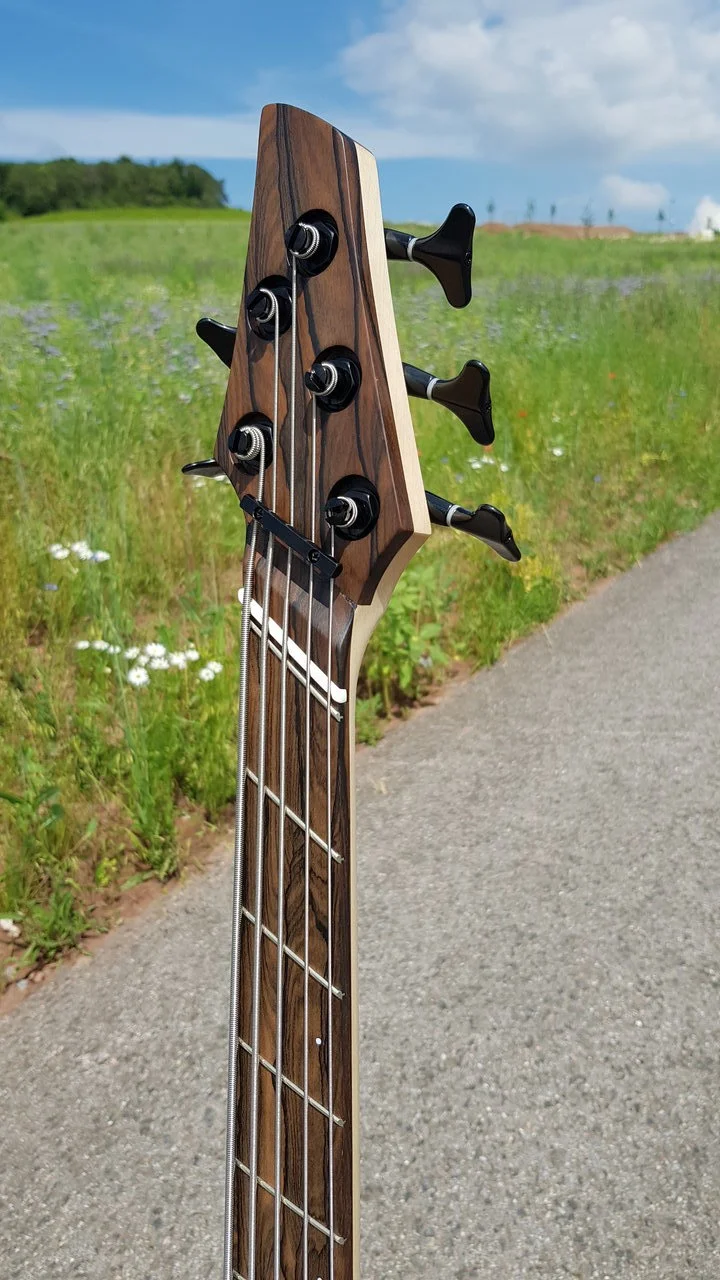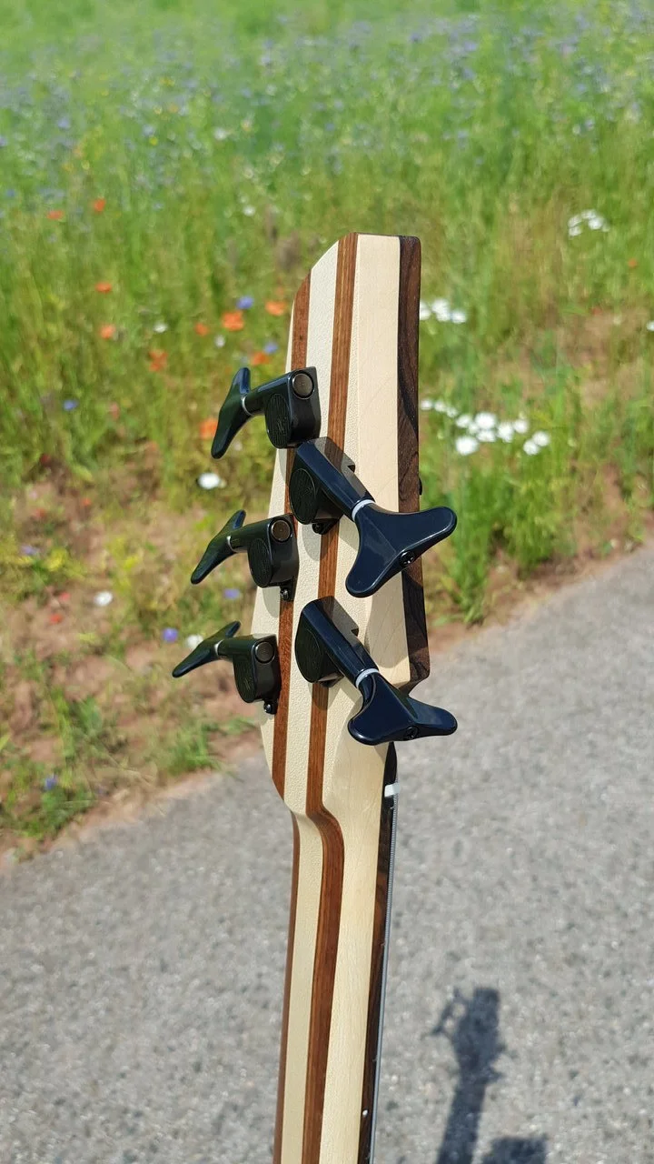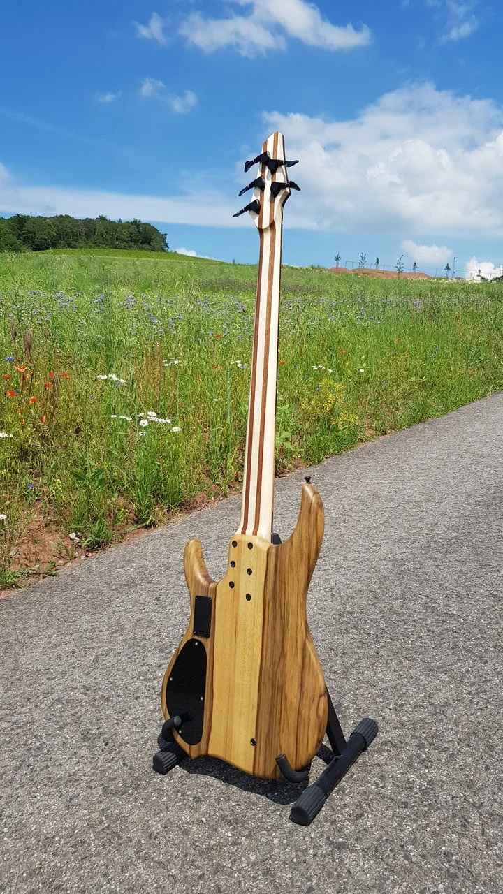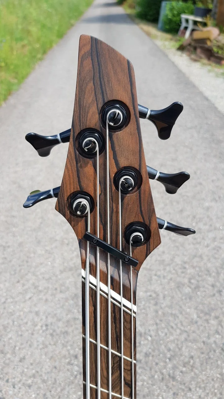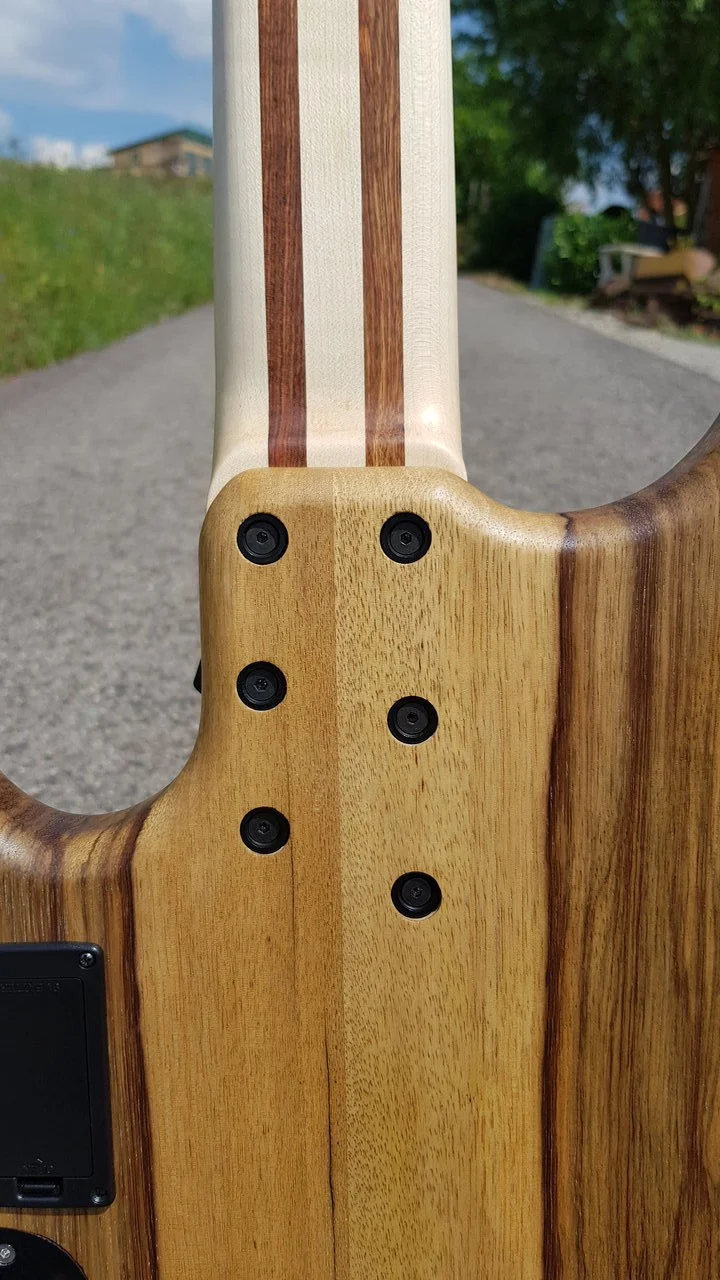 Das Stück Chechen hatte extremes übermaß, daher entschied ich mich aus einem Stück Ahorn und 2 Abschnitten des Chechen einen 5 Teiligen Halsrohling zu fertigen. Ein Griffbrett konnte ich auch noch aus dem Stück Chechen auftrennen. Das Anfertigen des mehrteiligen Halsrohlings war ein Novum für mich, das Ergebnis finde ich aber sehr gelungen für mein erstes Mal.