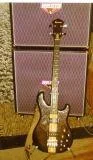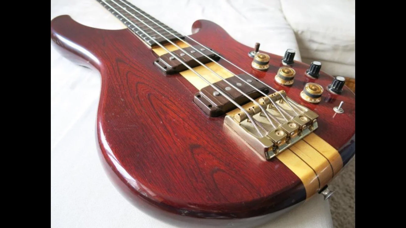 Das Korpusholz kann ich leider nicht identifizieren, allerdings glaube ich, dass die Decken (vorne und hinten) aus Esche sind. Der Hals ist eindeutig aus Ahorn, die schmalen Streifen könnten aus Walnuss sein. Das Griffbrett ist sehr dunkel und fühlt sich glatt an, daher vermute ich Ebenholz, könnte aber auch Rosewood sein. Die markante Form des Headstocks findet man bis heute bei aktuellen Ibanez Modellen. Der Sattel bei diesem Bass wurde durch einen Warwick-Messingsattel ausgetauscht. Die Standard Sättel sind aus Knochen.