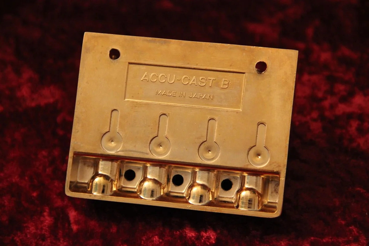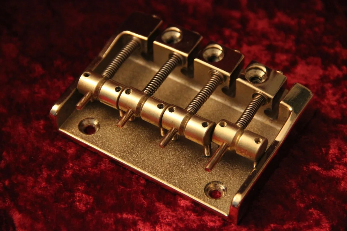 Die fünffach verschraubte Messingbrücke ist zwar recht massiv, dennoch haben die Reiter viel Spiel. Leider gibt es für die Madenschrauben keine Führungen, weswegen sie fröhlich hin und her wackeln können. Auf der Rückseite befindet sich die Gravur der Modellbezeichnung. Je nach Jahrgang wurden unterschiedliche Brücken verbaut. Die meisten unterscheiden sich jedoch nur von den Reitern, nicht aber vom Gestell.