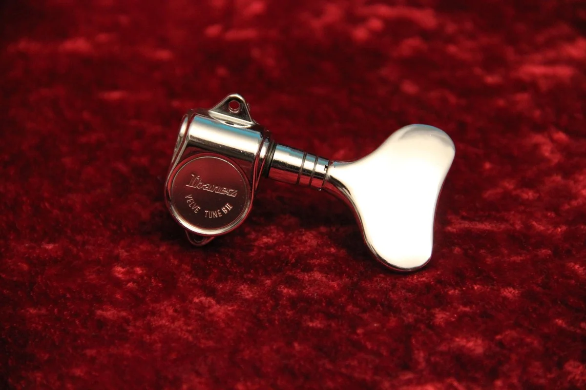 Die geschlossenen Chrome-Mechaniken sind ebenfalls von Ibanez. Leicht von Schaller abgeguckt, aber viel massiver, mit breiten fendertypischen Zylindern. An den Flügeln gibt es keine Feststellschrauben. Mit den Jahren hat sich viel Dreck darin angesammelt, daher spürt man beim drehen ein leichtes Kratzen. Schwergängig sind sie m. E. aber nicht. Ansonsten keine Raketentechnik. Viele Musician Bässe haben mittlerweile ersetzte Mechaniken, daher sind die Originale sehr gefragt.