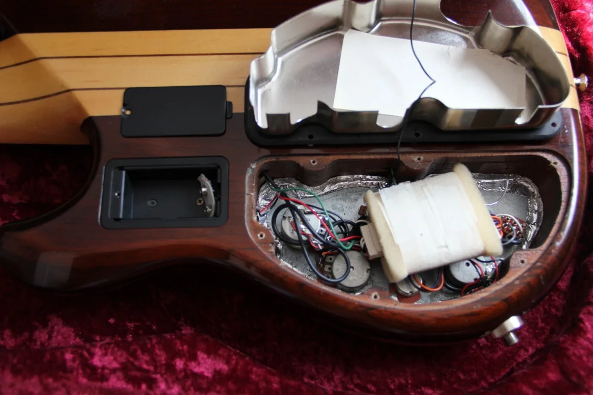 Der Bass ist sowohl aktiv als auch passiv spielbar. Zum Einsatz kommt hier eine klassische Drei-Band-Elektronik mit Bässen, Mitten und Höhen. Beim Öffnen des E-Fachs hatte ich so meine Schwierigkeiten. Irgendetwas hielt die Kappe fest. Nach mehrfachen Versuchen erfuhr ich auch was: Eine auf den Deckel geklebte Abschirmung aus Metall, die das komplette E-Fach umschließt. Sogar die Klinkenbuchse umhüllt ein Zylinder aus dem gleichen Material. Sowas habe ich noch nie bei anderen Bässen gesehen. Da hätte doch normale Abschirmfolie komplett ausgereicht. Die Teile sind nämlich ziemlich schwer und tragen deutlich zum Gesamtgewicht bei. Wahrscheinlich hieß es damals „Qualität hat sein Gewicht“