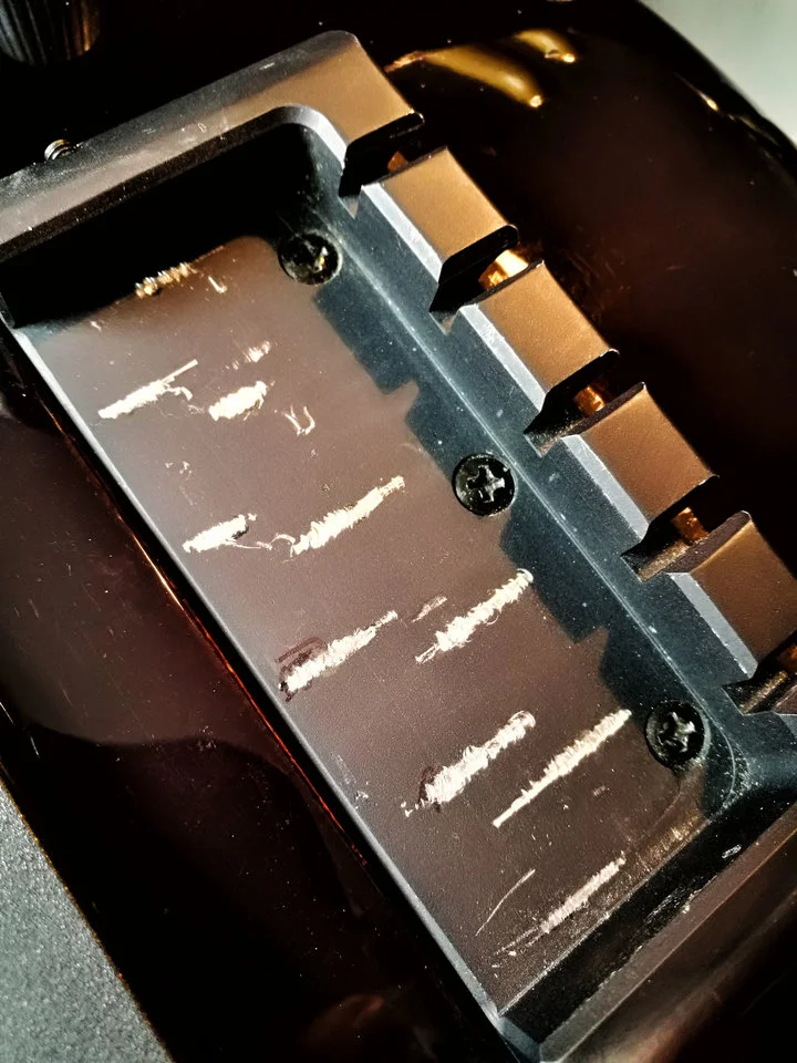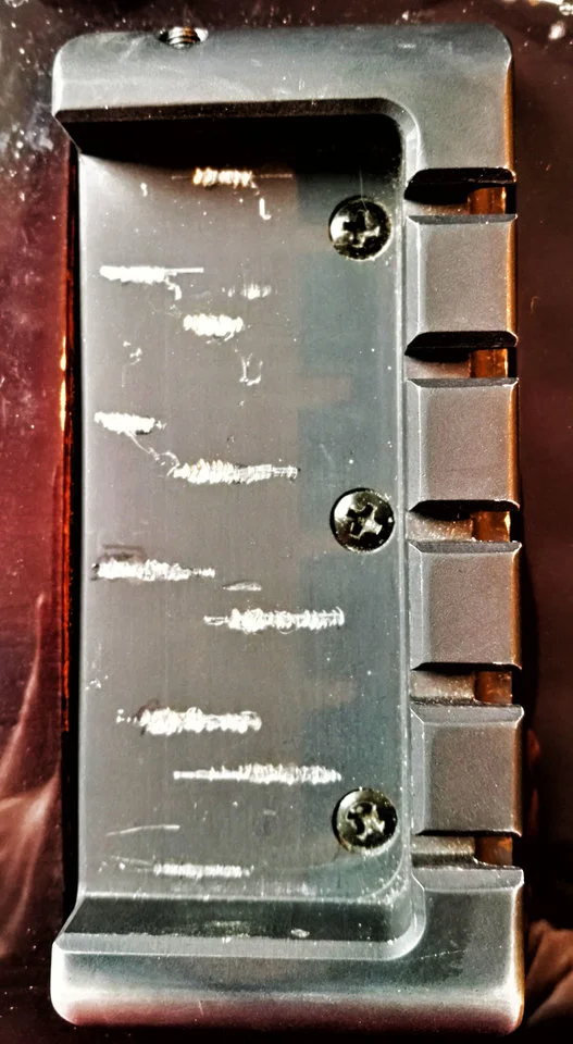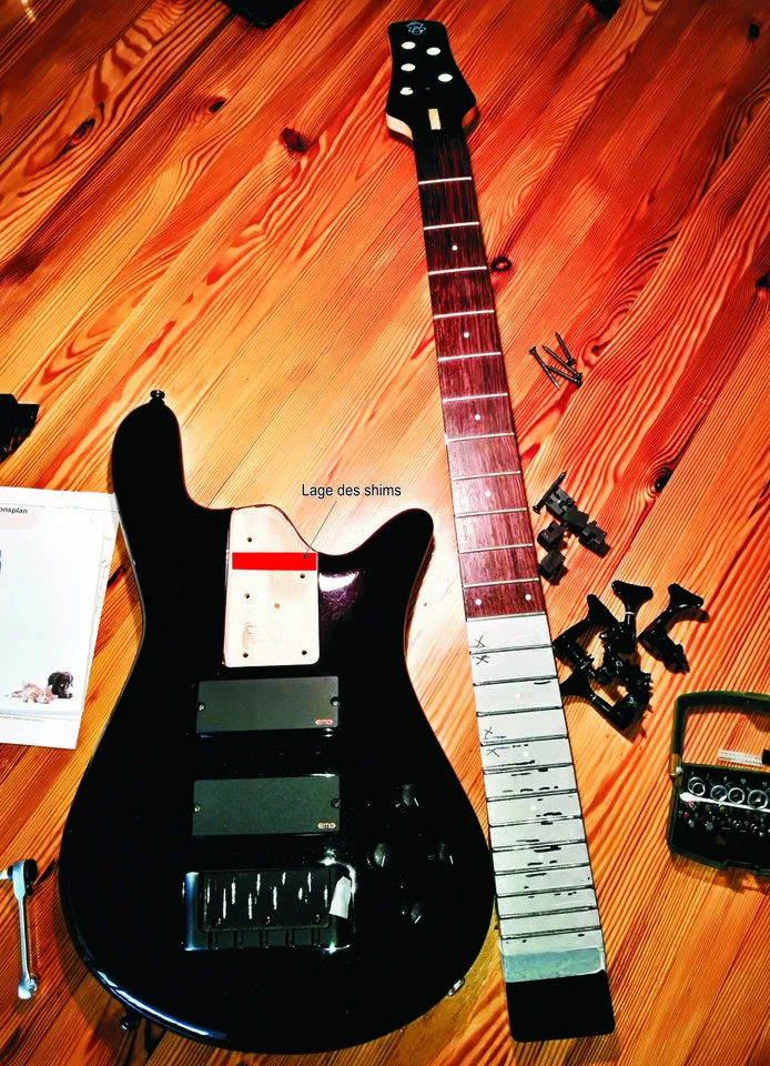 In der Hoffnung, das Schnarren ganz zu beseitigen, habe ich in langen Sitzungen die shim-Stärke nach und nach auf 1,4 mm (entspricht einem Winkel von fast 1°) erhöht. Folge: um den Bund-Saitenabstand im 12. Bund auf 1,6 mm zu setzen, mußte der Reiter in der Brücke vollständig nach unten gesetzt werden. Keine gute Lösung, wie ich finde.