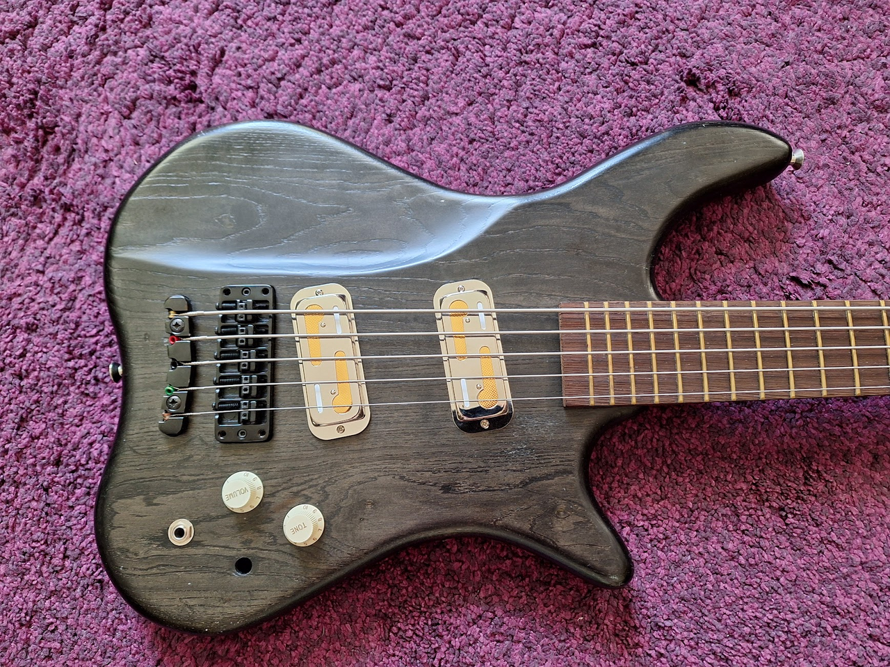 Vom Look her würde da dem Bass auch gut stehen mit dem goldenen Alu Pickguard und dem Seaform green Body.