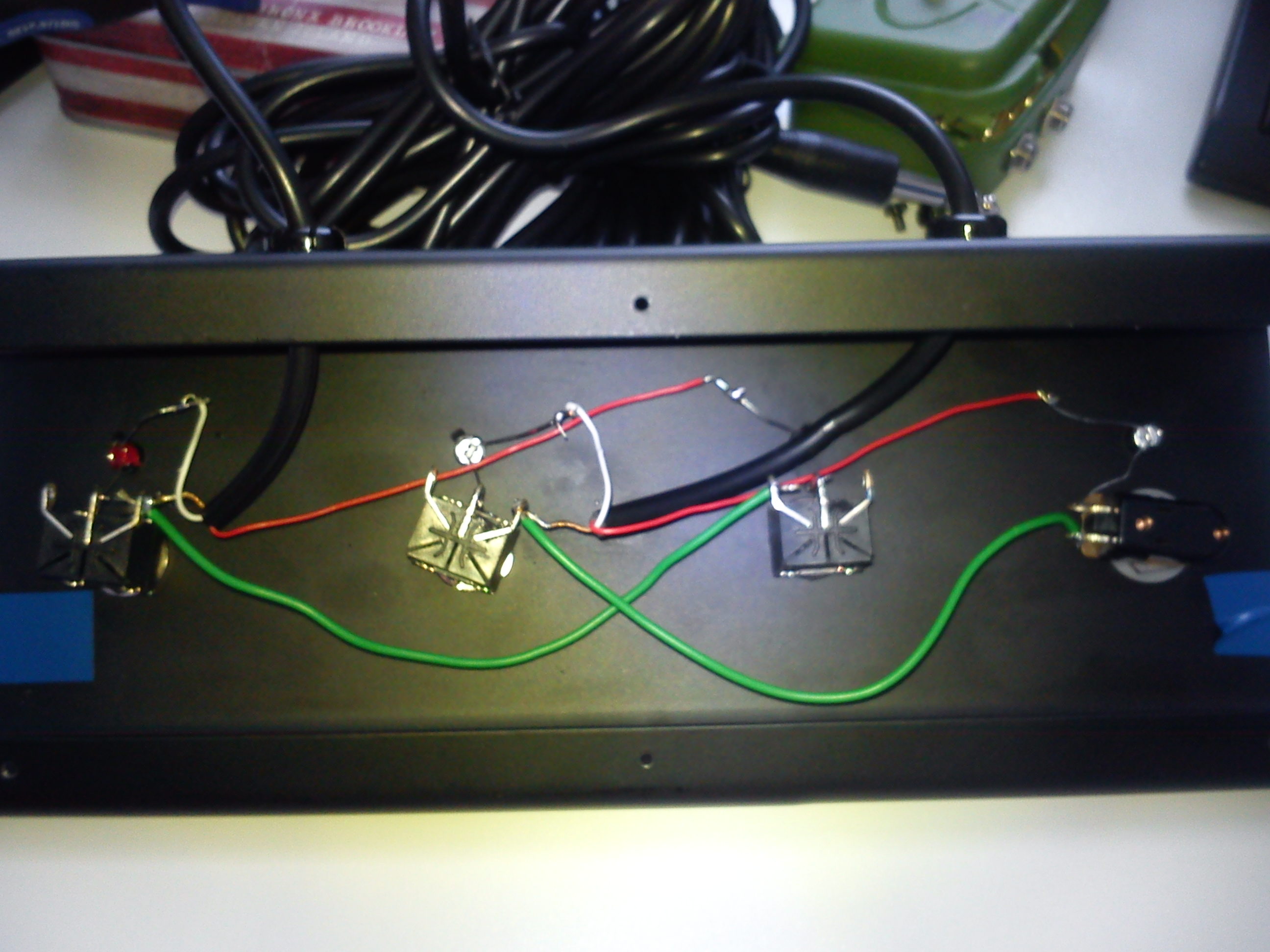 Als besonderheit wollte ich, dass einer der Schalter nur getreten aktiv ist und ein paar schöne farbige LED´s (2xBlau 1xweiß 1xrot). Ich habe mir dann einen einfachen 4-Fach Fußschalter mit 2 Stereokabeln von der Musikstore Hausmarke Fame bestellt um ein Gehäuse und die Fußschalter zu haben. Zudem hab ich noch einen simplen Fußtaster gekauft.