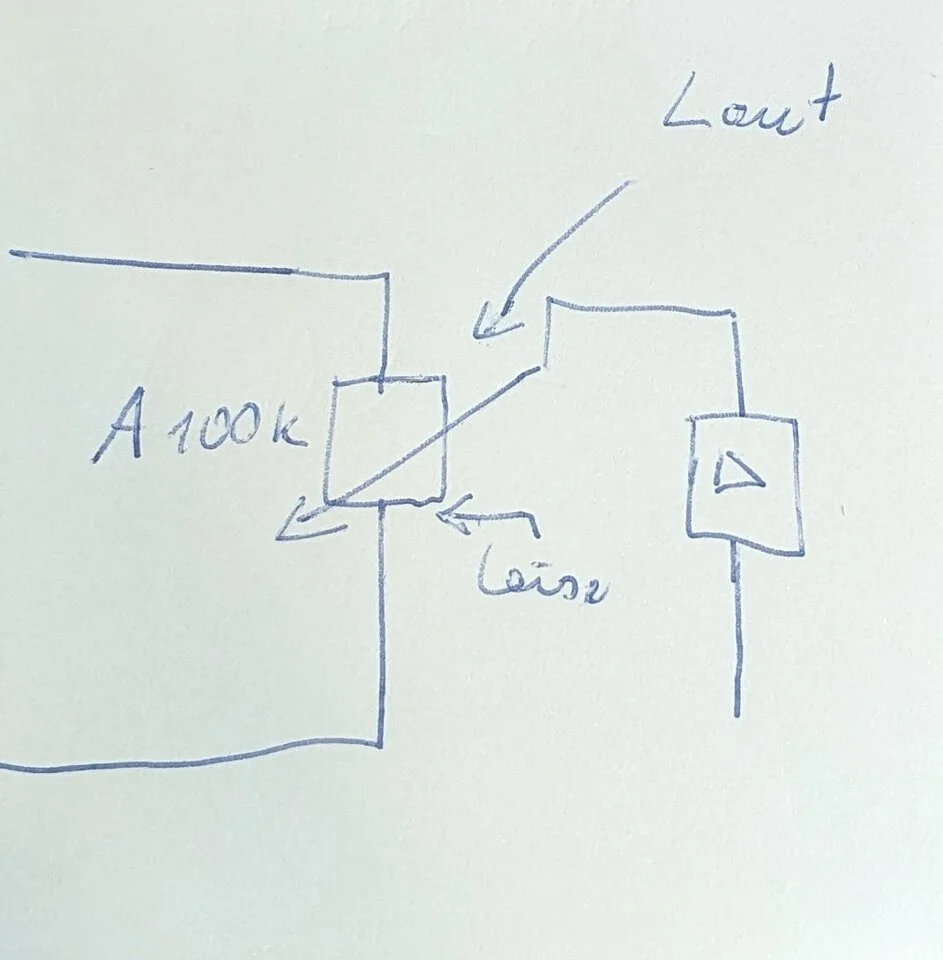 Da sind A100K drin, aus dem Bauch raus könnte hier ja ein 50 oder 25k das Problem beseitigen. Natütlich auch in A wie Logarithmisch? Vom Prinzip her sind die auch wie die Gain angelötet, Schleifer und rechter Kontakt zusammengelötet und Schleifer ganz links Leise & "quasi durchgang".