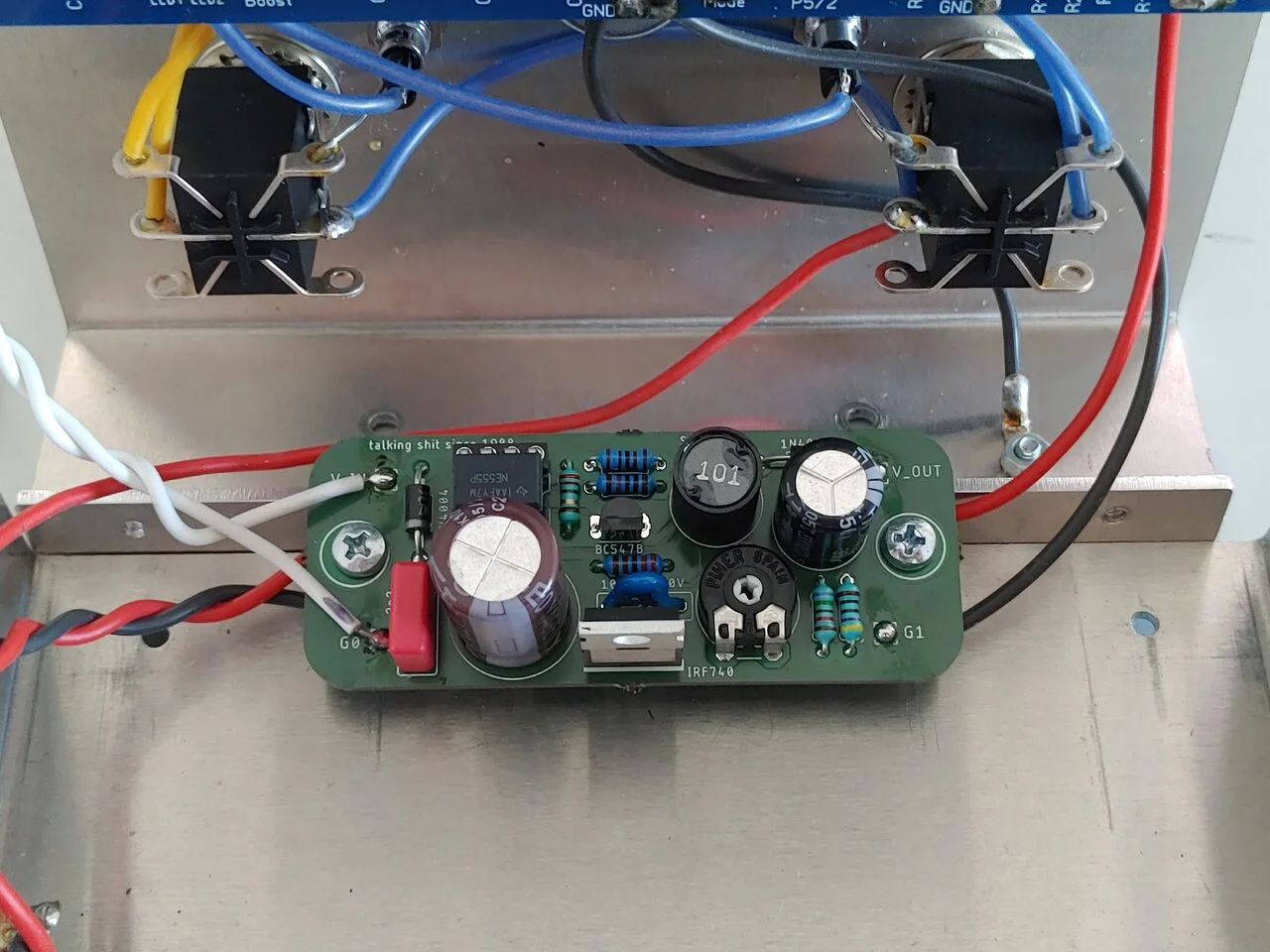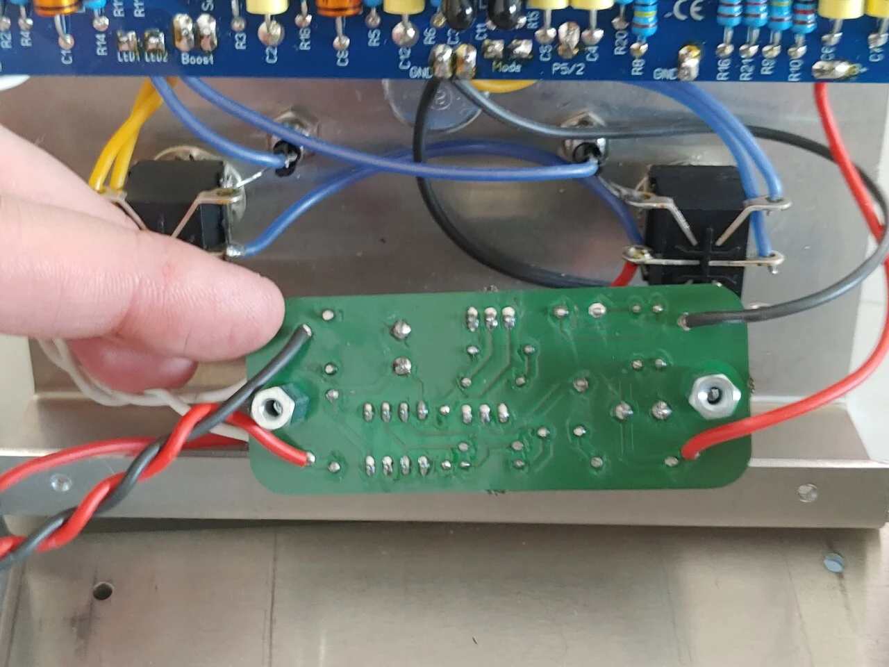 Prinzipbedingt ist der Ausgang ziemlich hochohmig, zum Anschluss an Effekt-return oder Endstufe also nur eingeschränkt geeignet. Hier könnte man noch einen Fet als Impedanzwandler nachschalten, dann ließe sich mit einem guten Trafo auch ein DI-out realisieren -mal schauen...