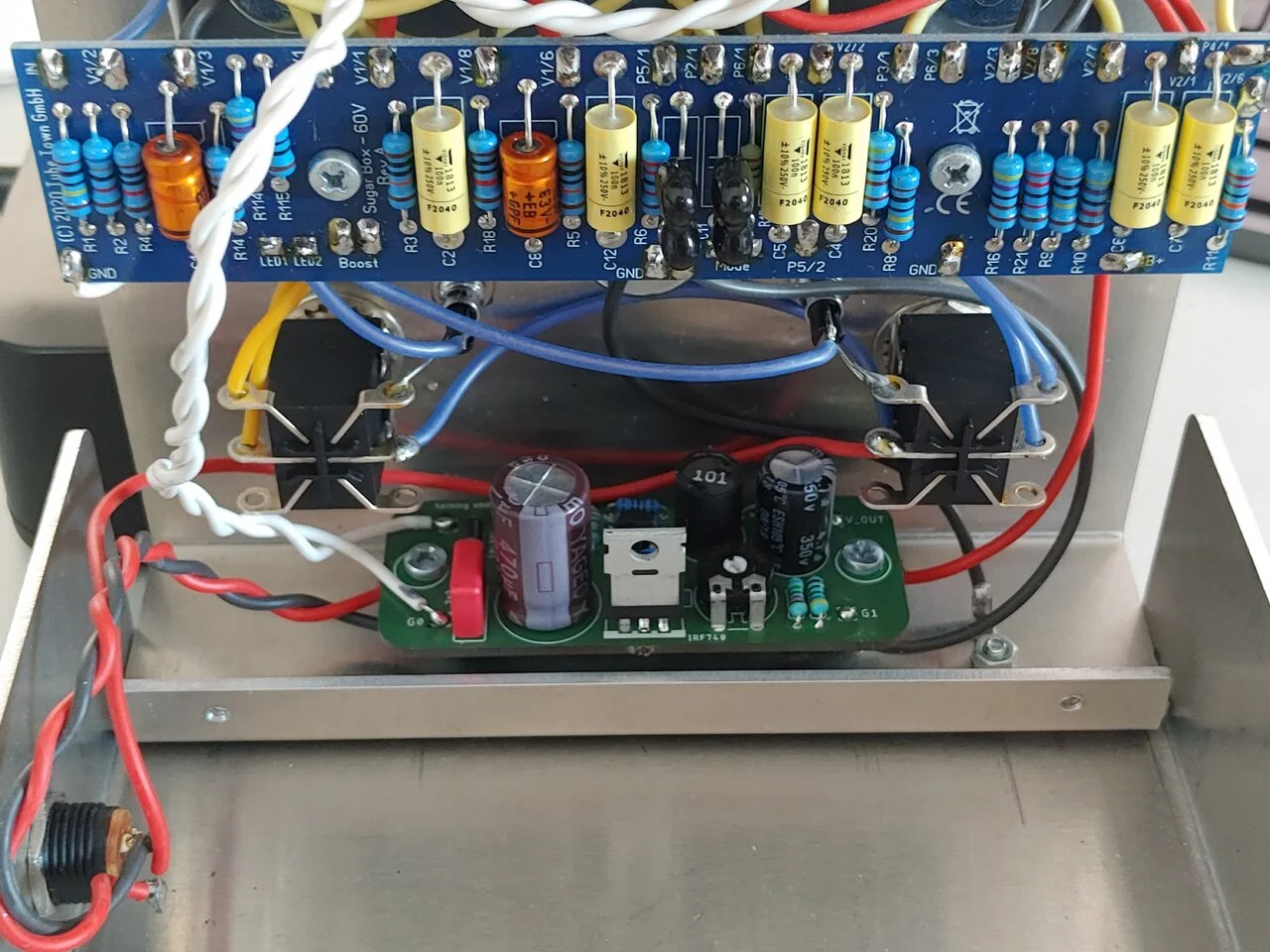 Soundmäßig ist das besondere, dass trotz der passiven Tonregelung eine simple, aber effektive "semiparametrische" Mittenregelung realisiert wurde, d.h. der Mid-Regler regelt die Frequenz und der Sugar-Regler den Anteil der Mitten -und damit kann man schon eine ganze Menge anfangen... Beim Aufziehen des Gain bleibt der Preamp noch lange sauber und wirkt erstmal als Comp mit satter Betonung des Anschlags, erst später kommt dann die Zerre. Im cleanen Bereich ist der Grundsound eher glockig klar als mittenbetont, das kann man aber auch ganz gut verbiegen. Mir waren es sogar zu viele Höhen, deshalb habe ich ein RC-Glied über das Master-Poti gelötet. Den für mich unnützen HiBoost habe ich zum Mute-Schalter umfunktioniert. Der Low-Boost ist eine Mogelpackung, denn damit wird die Gesamtverstärkung hochgeschaltet.
