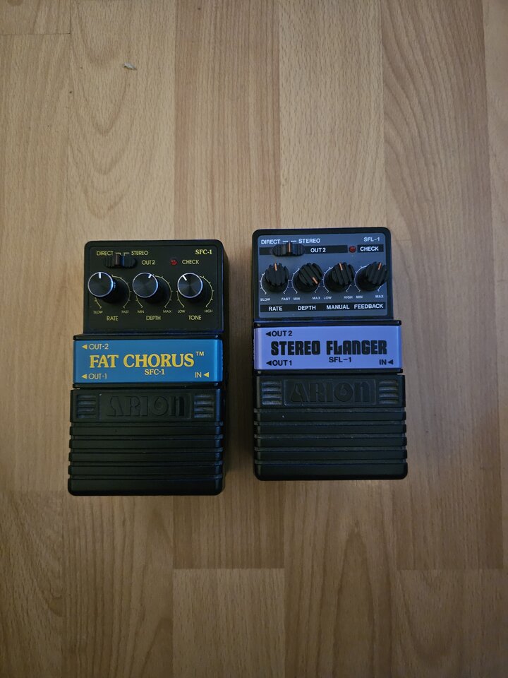 Ich habe gestern meine beiden Arions abgeholt. Baujahre dürften so bei 85-90 liegen. Der Fat Chorus macht seinem Namen alle Ehre, da geht Bass, alter Verwalter! Der Flanger hat einen interessanten Effect im Effekt, dieser Treter macht neben dem Flangereffekt an sich auch noch eine Art Mouth Organ Sound dazu, nur leicht, hört sich aber crazy an. Muss ich mal was aufnehmen.
